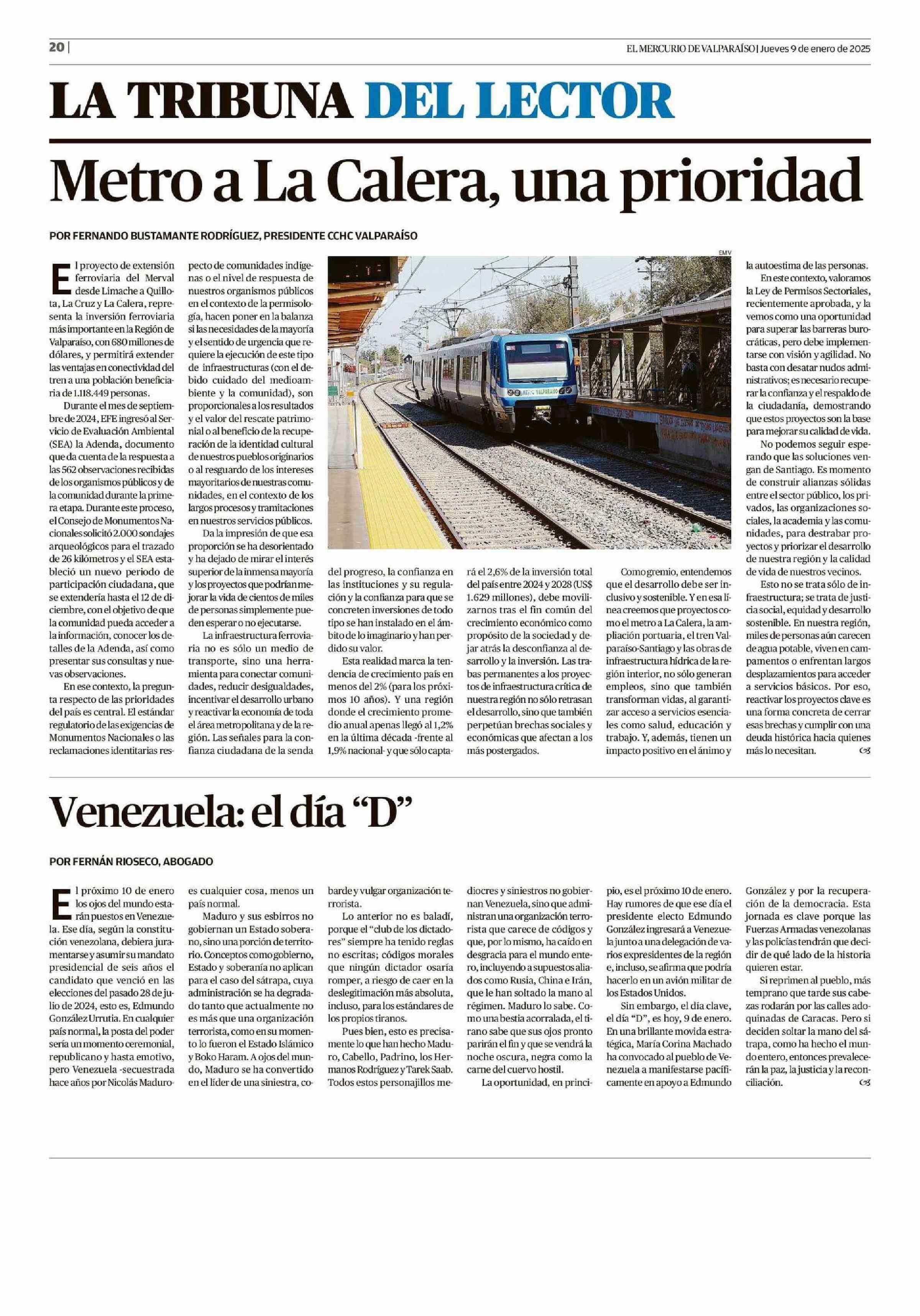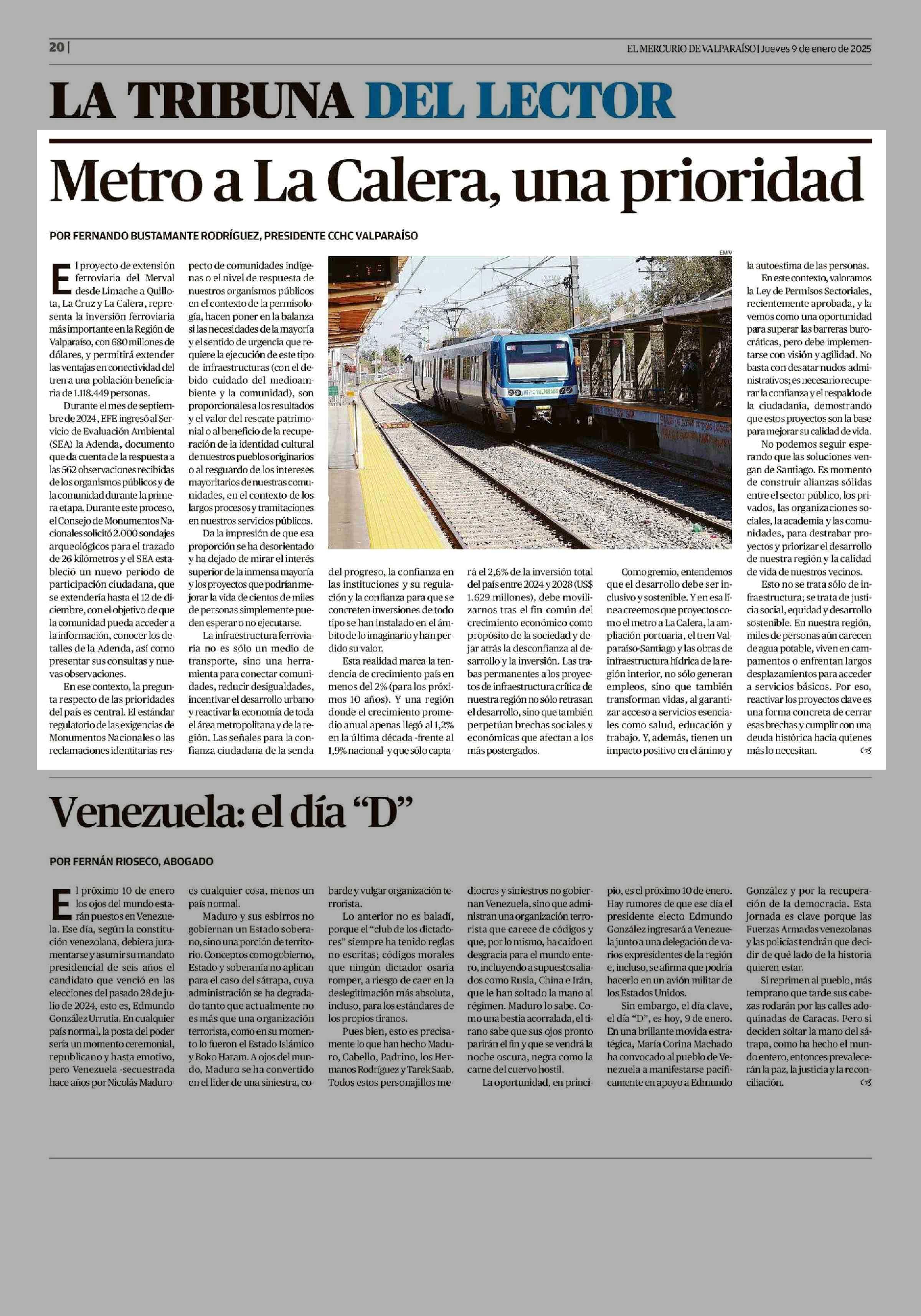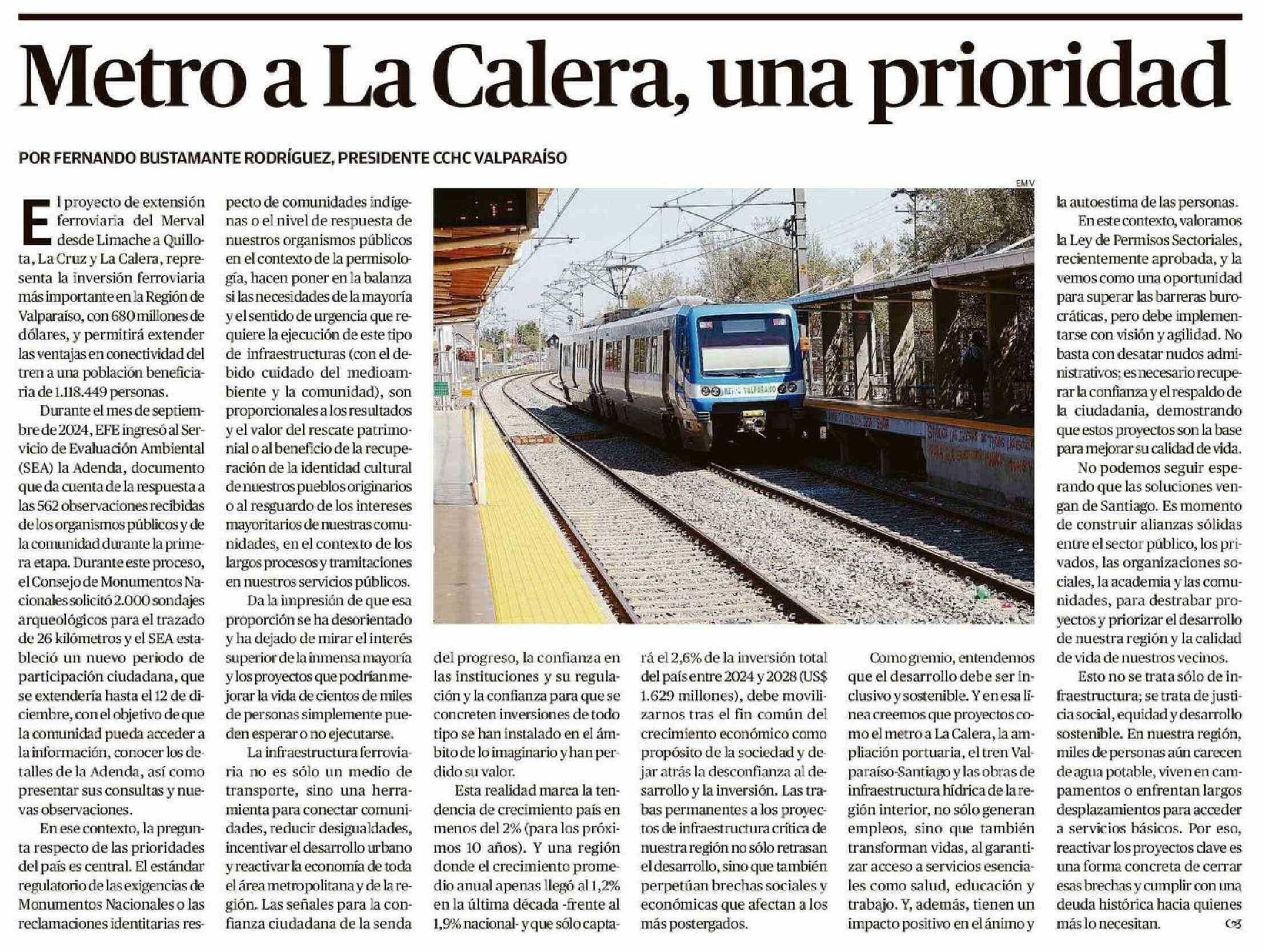 Columnas de Opinión: Metro a La Calera, una prioridad 09-01-2025 El Mercurio de Valparaíso |