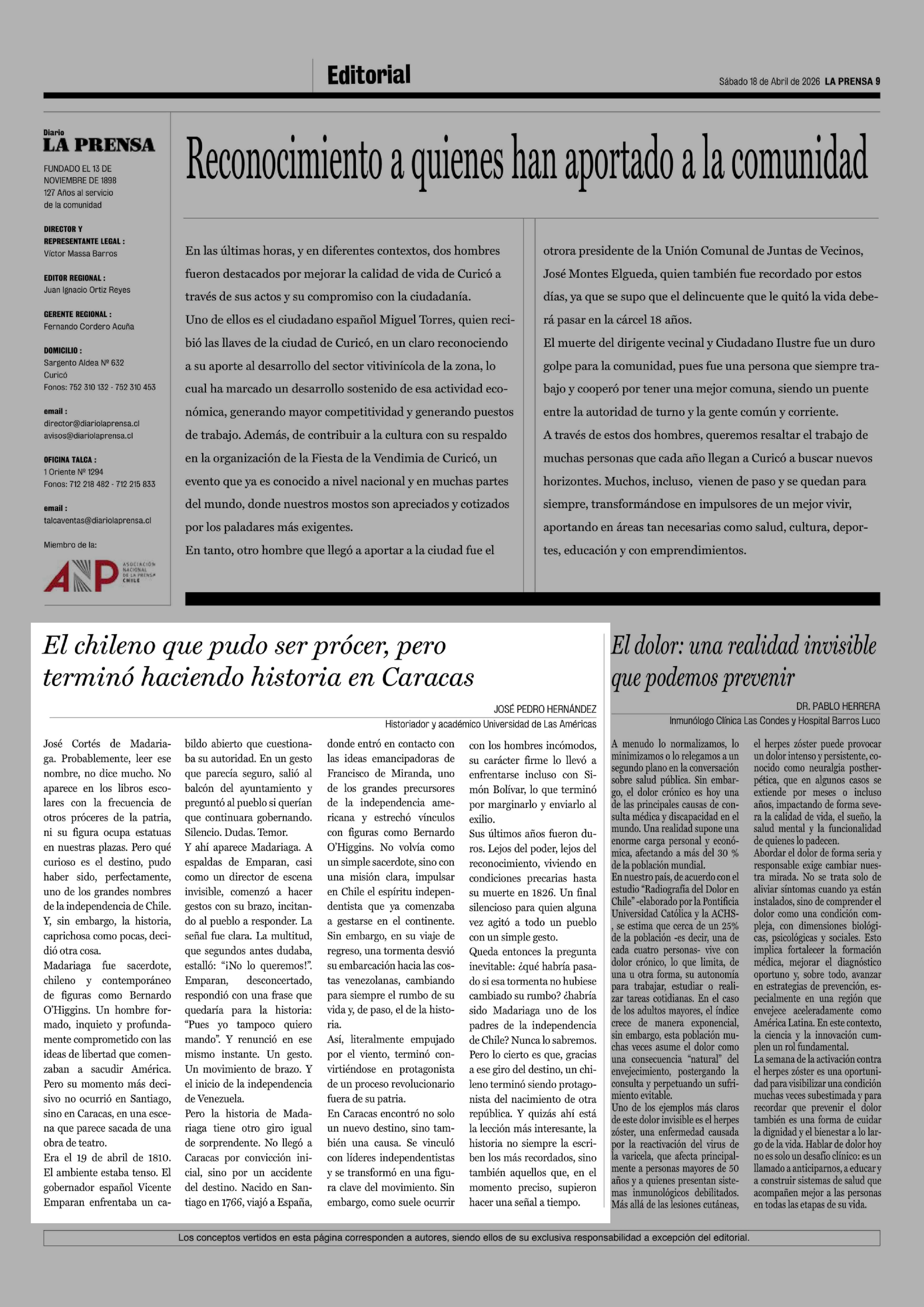 Cartas: El chileno que pudo ser prócer, pero terminó haciendo historia en Caracas 18-04-2026 La Prensa de Curicó |