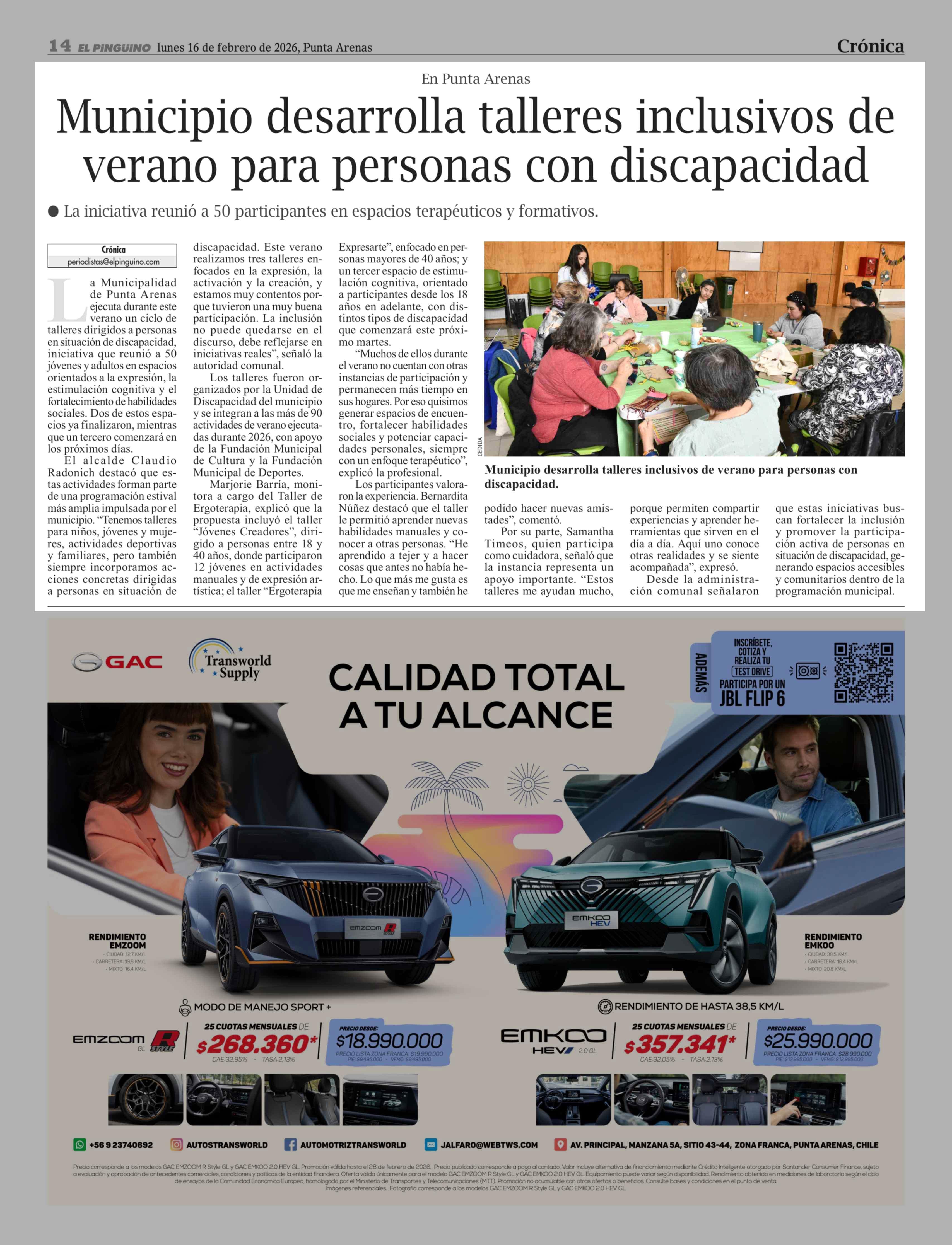 Municipio desarrolla talleres inclusivos de verano para personas con discapacidad 16-02-2026 El Pingüino |