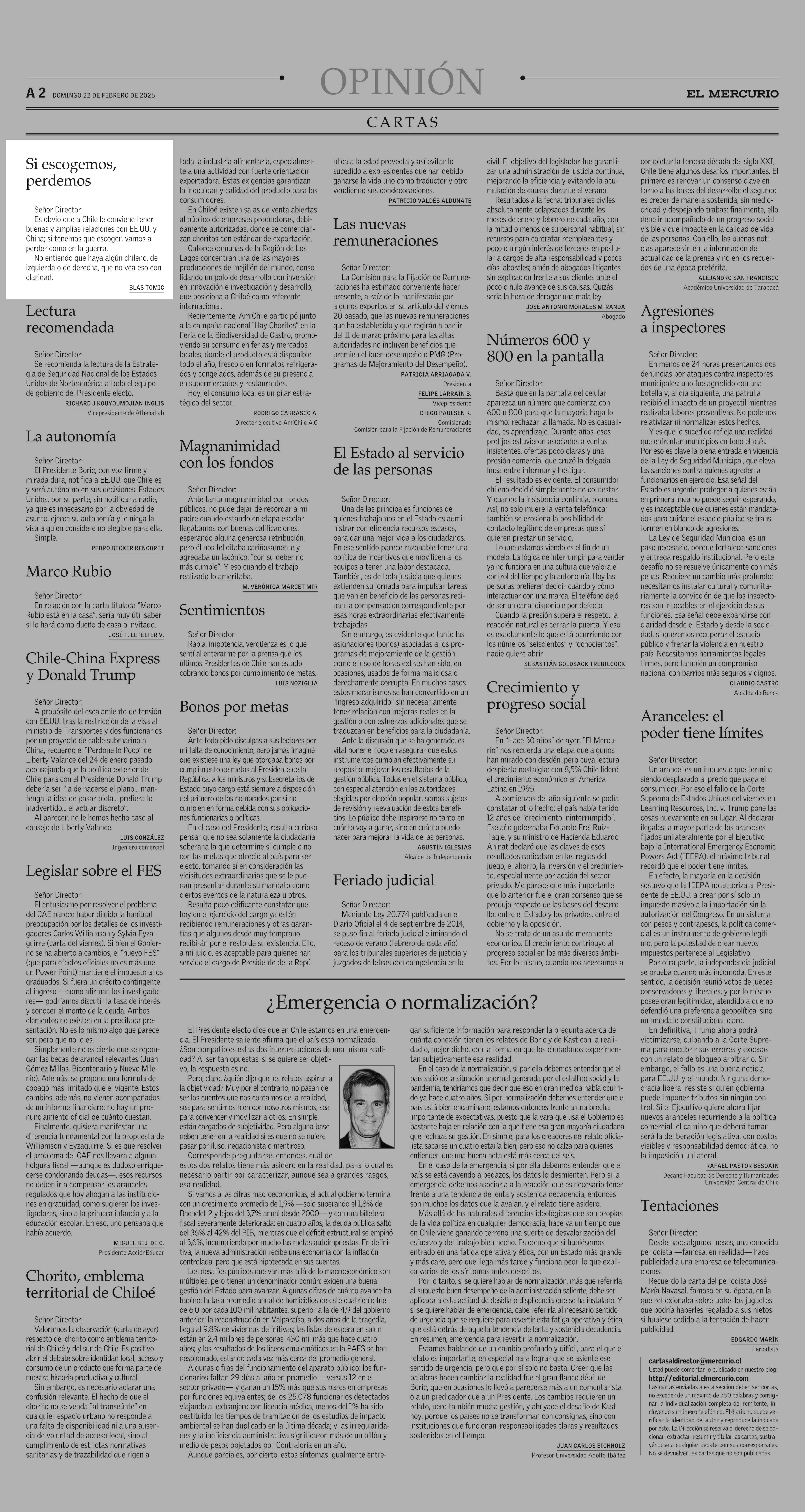 CARTAS: Si escogemos, perdemos 22-02-2026 El Mercurio |