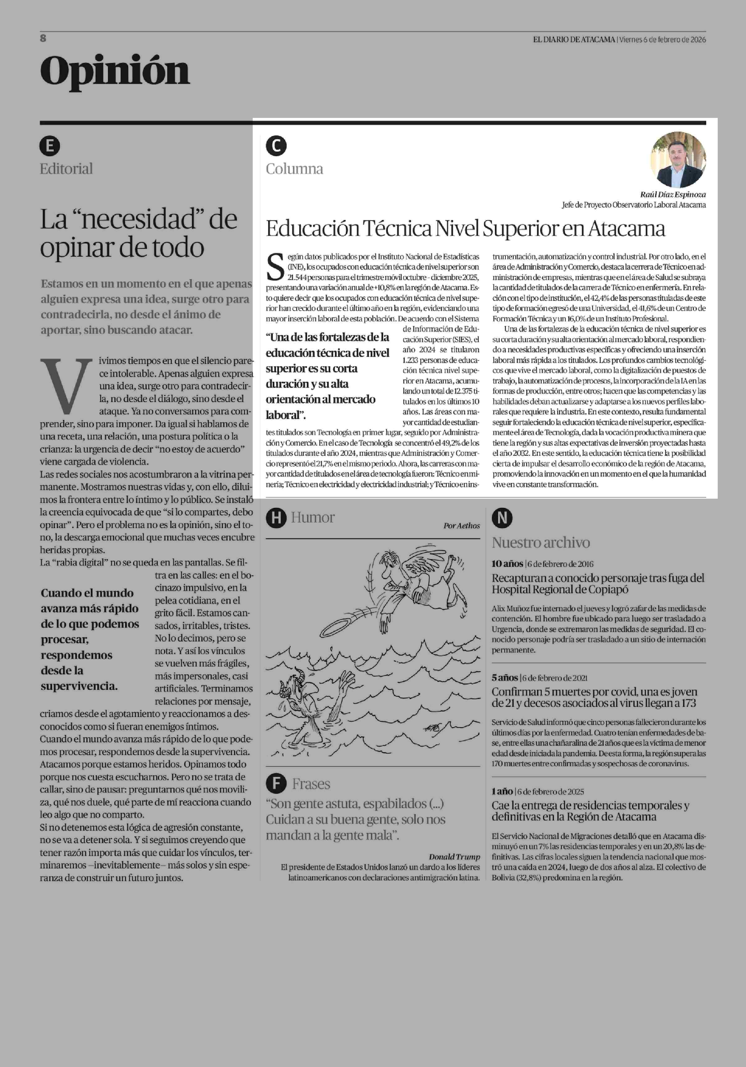 Columnas de Opinión: Educación Técnica Nivel Superior en Atacama 06-02-2026 El Diario de Atacama |