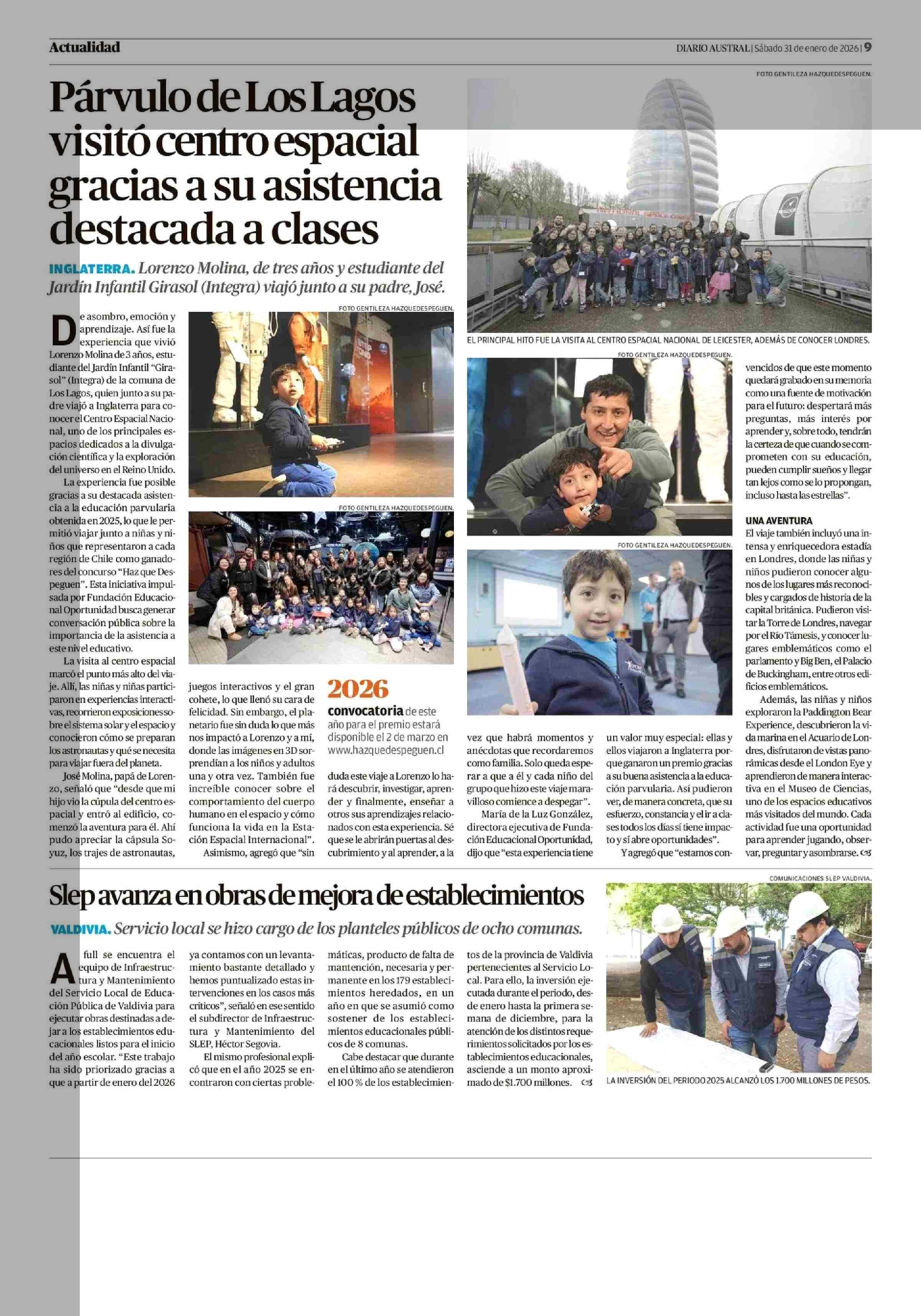 Párvulo de Los Lagos visitó centro espacial gracias a su asistencia destacada a clases 31-01-2026 Diario Austral Región de Los Ríos |