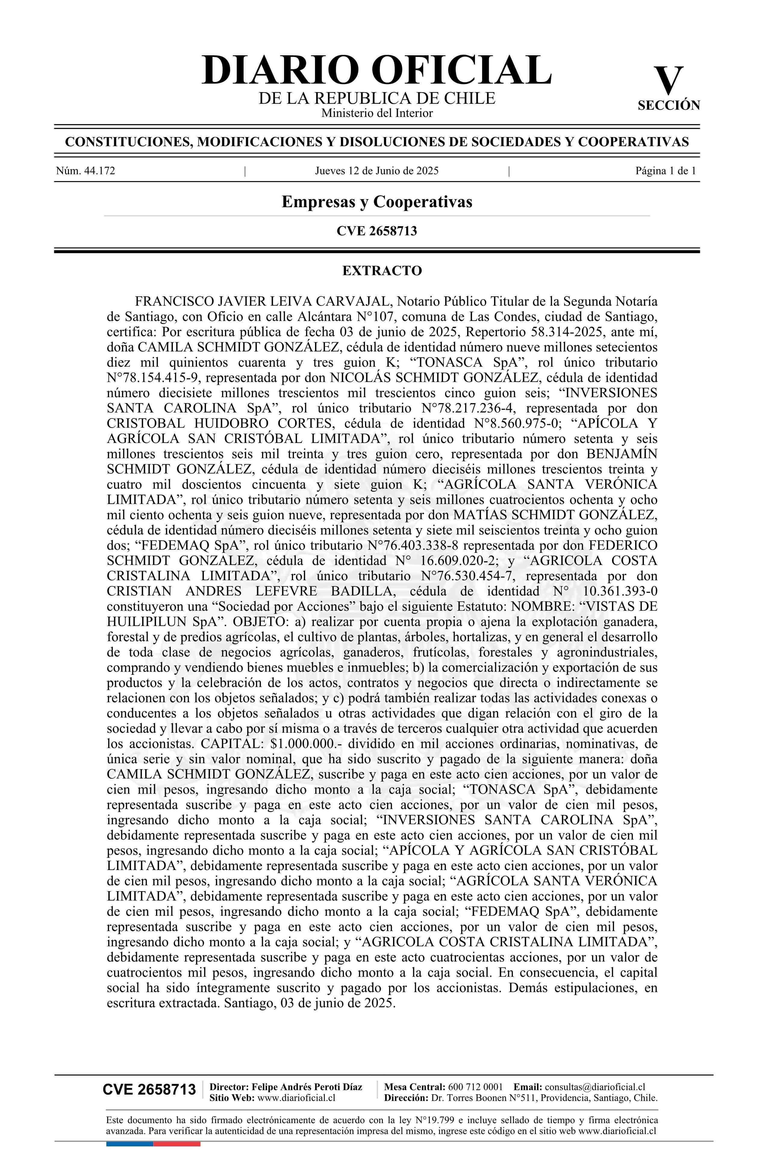 VISTAS DE HUILIPILUN SpA 12-06-2025 Diario Oficial Edición Electrónica |