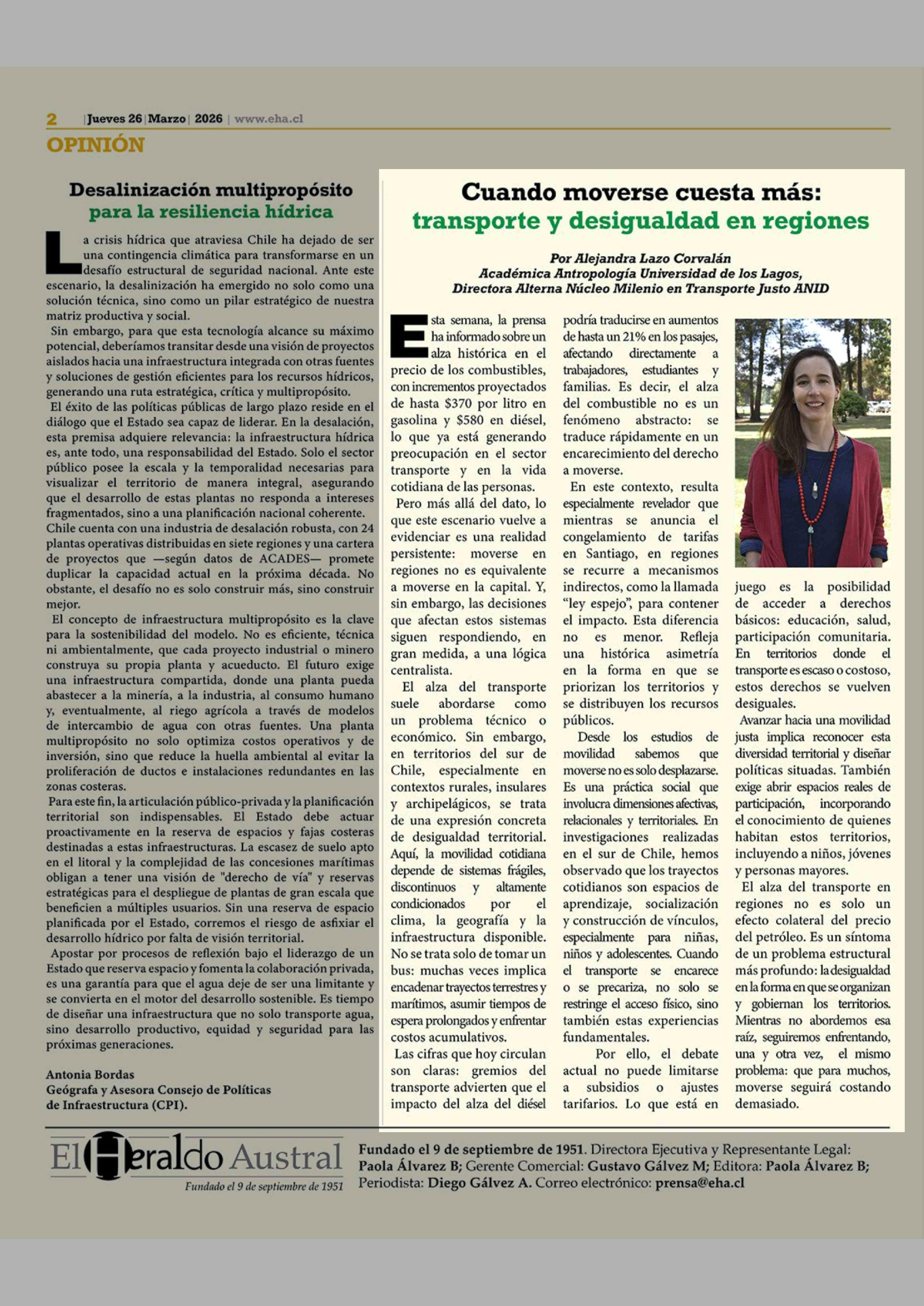 Columnas de Opinión: Cuando moverse cuesta más: transporte y desigualdad en regiones 26-03-2026 El Heraldo Austral |