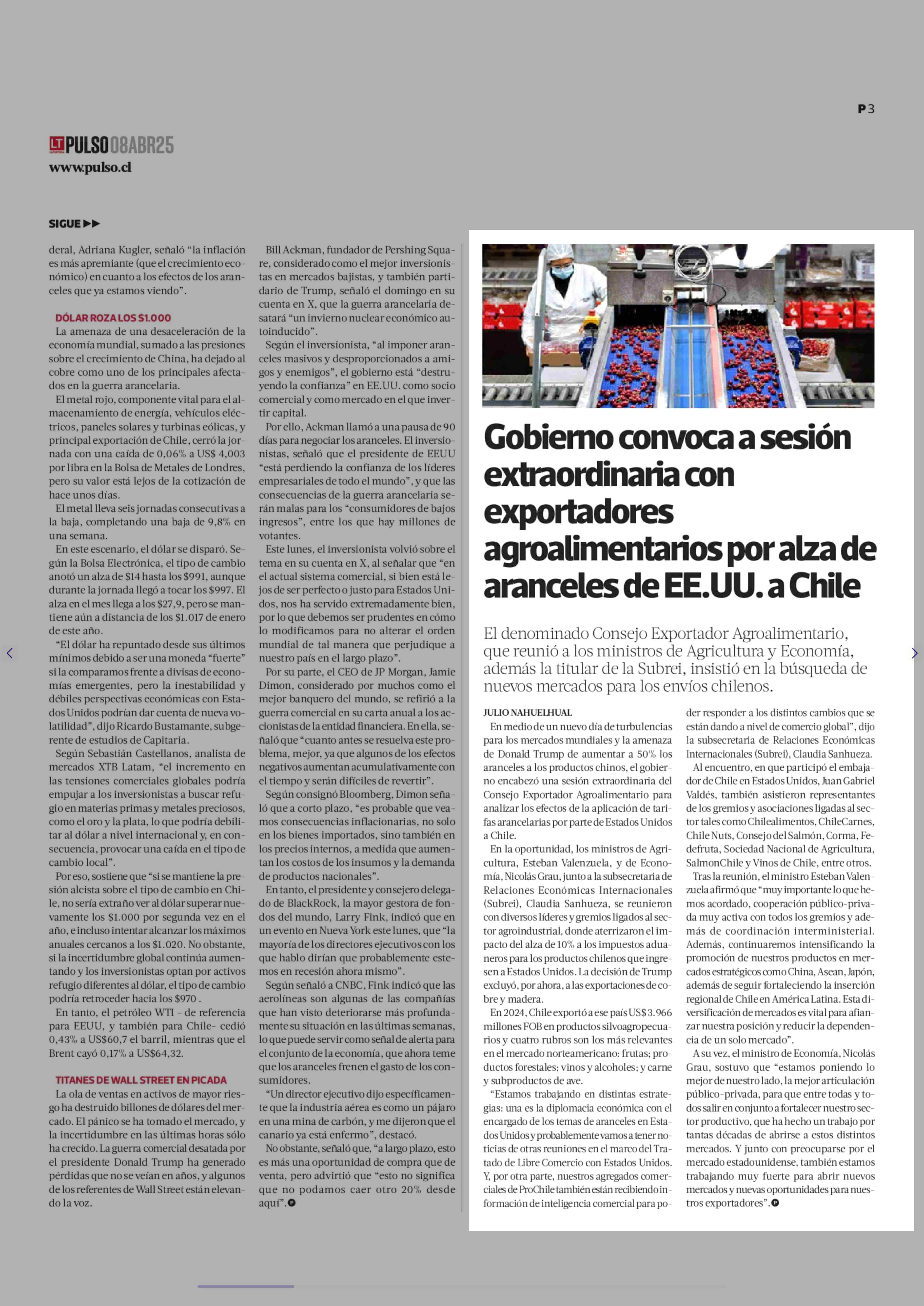 Gobiemo convoca a sesión extraordinanía con exportadores agroalimentarios por alza de aranceles de EE.UU. a Chile 08-04-2025 La Tercera |