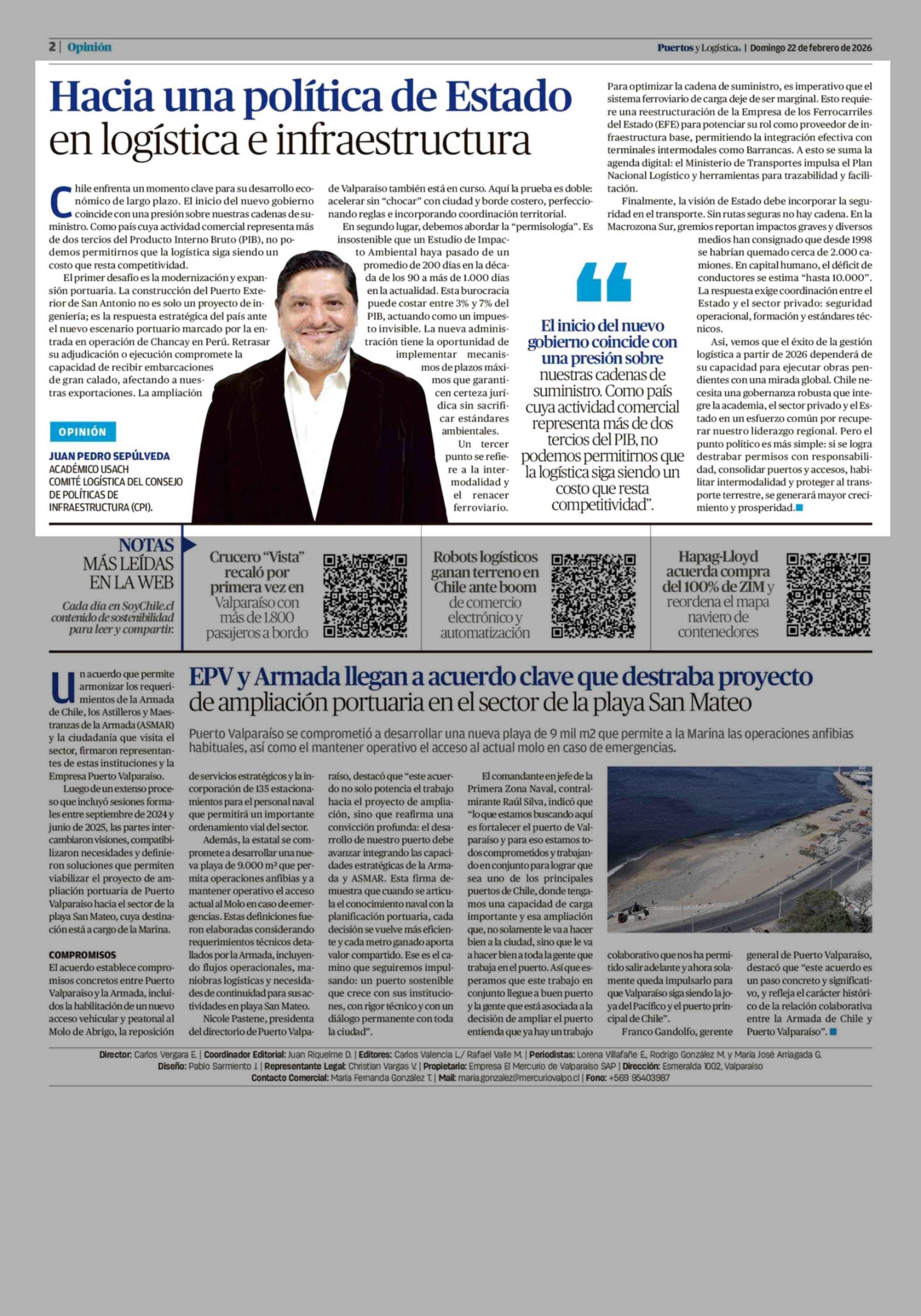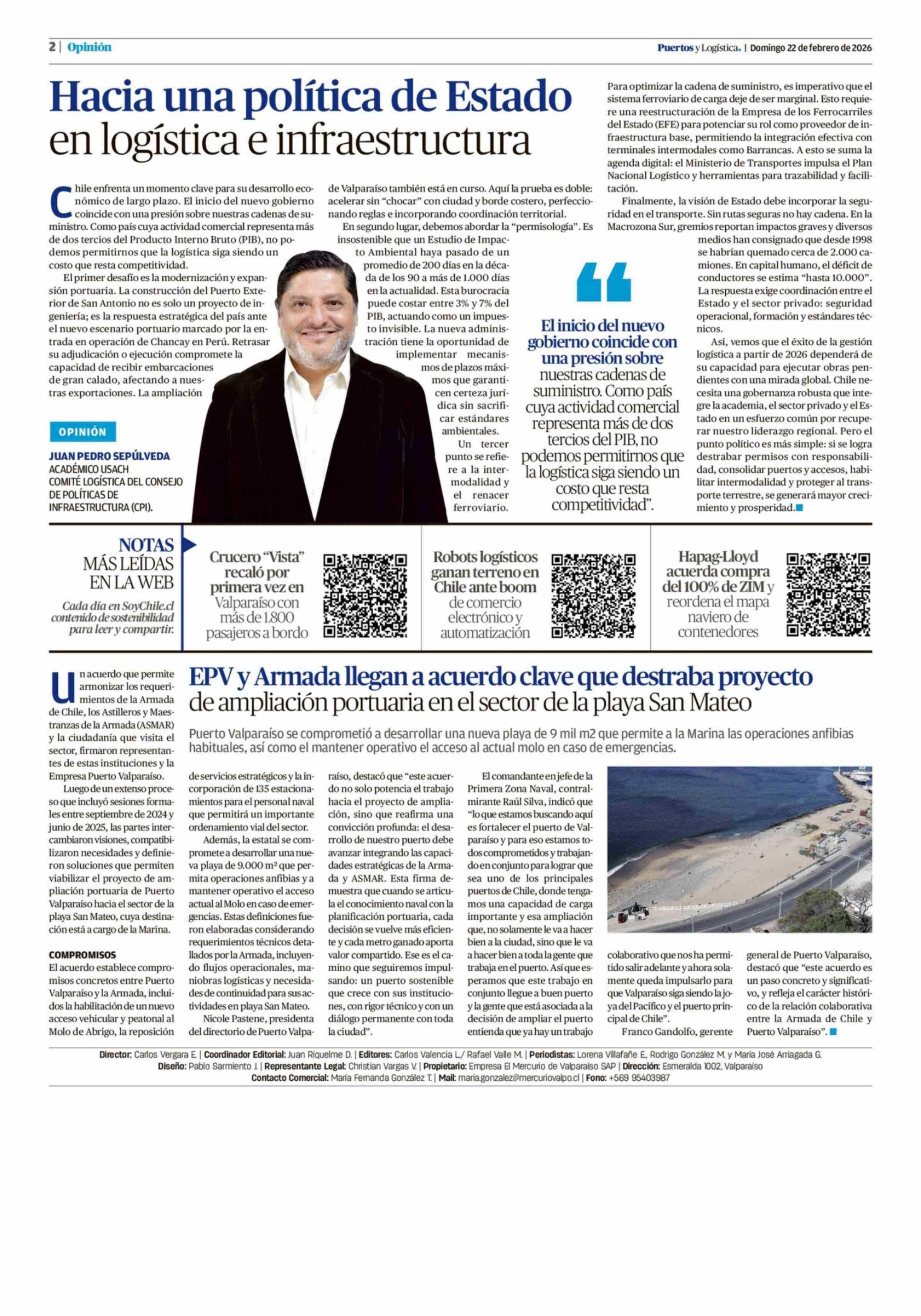 Columnas de Opinión: Hacia una política de Estado en logística e infraestructura 22-02-2026 El Mercurio de Valparaíso |