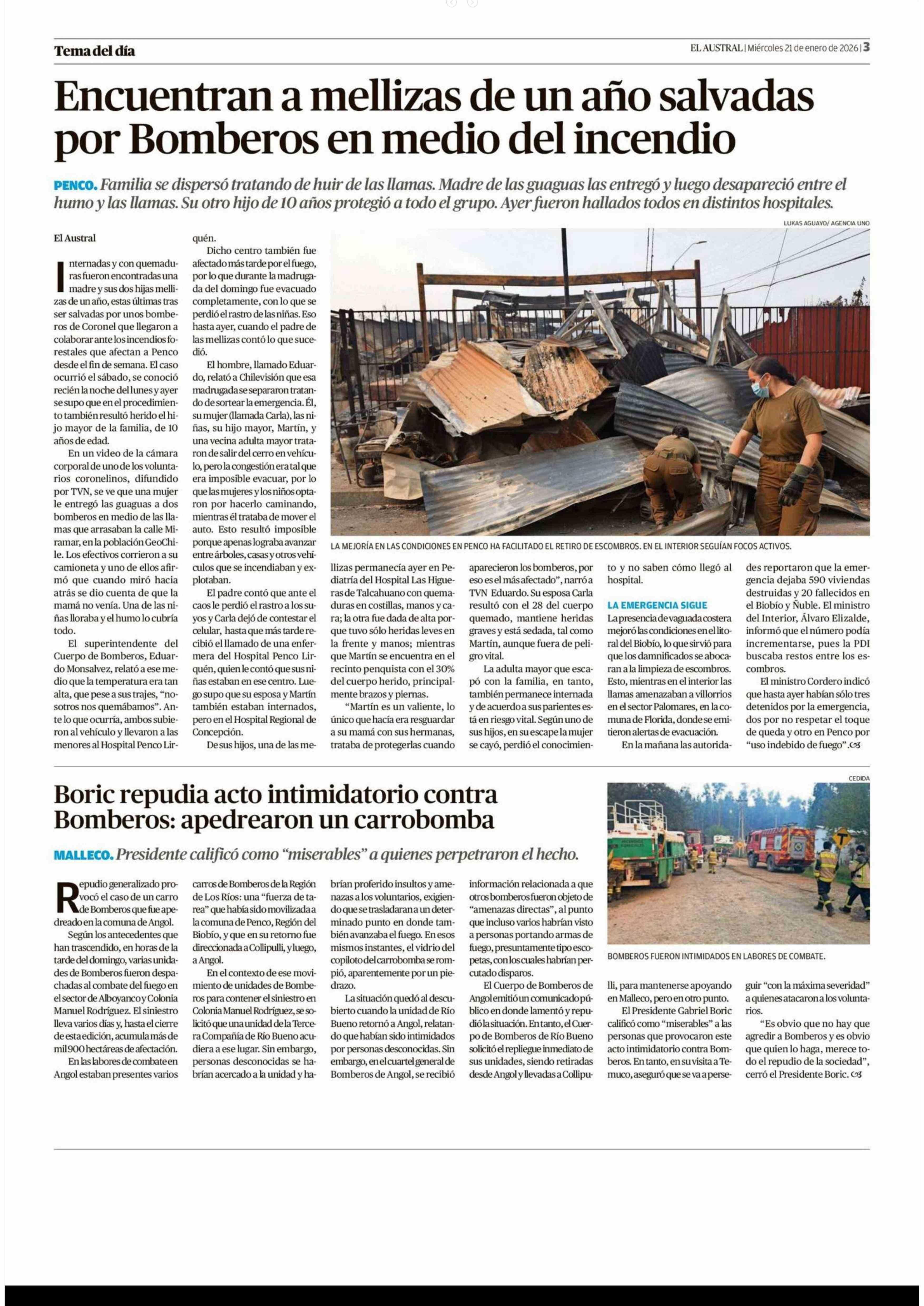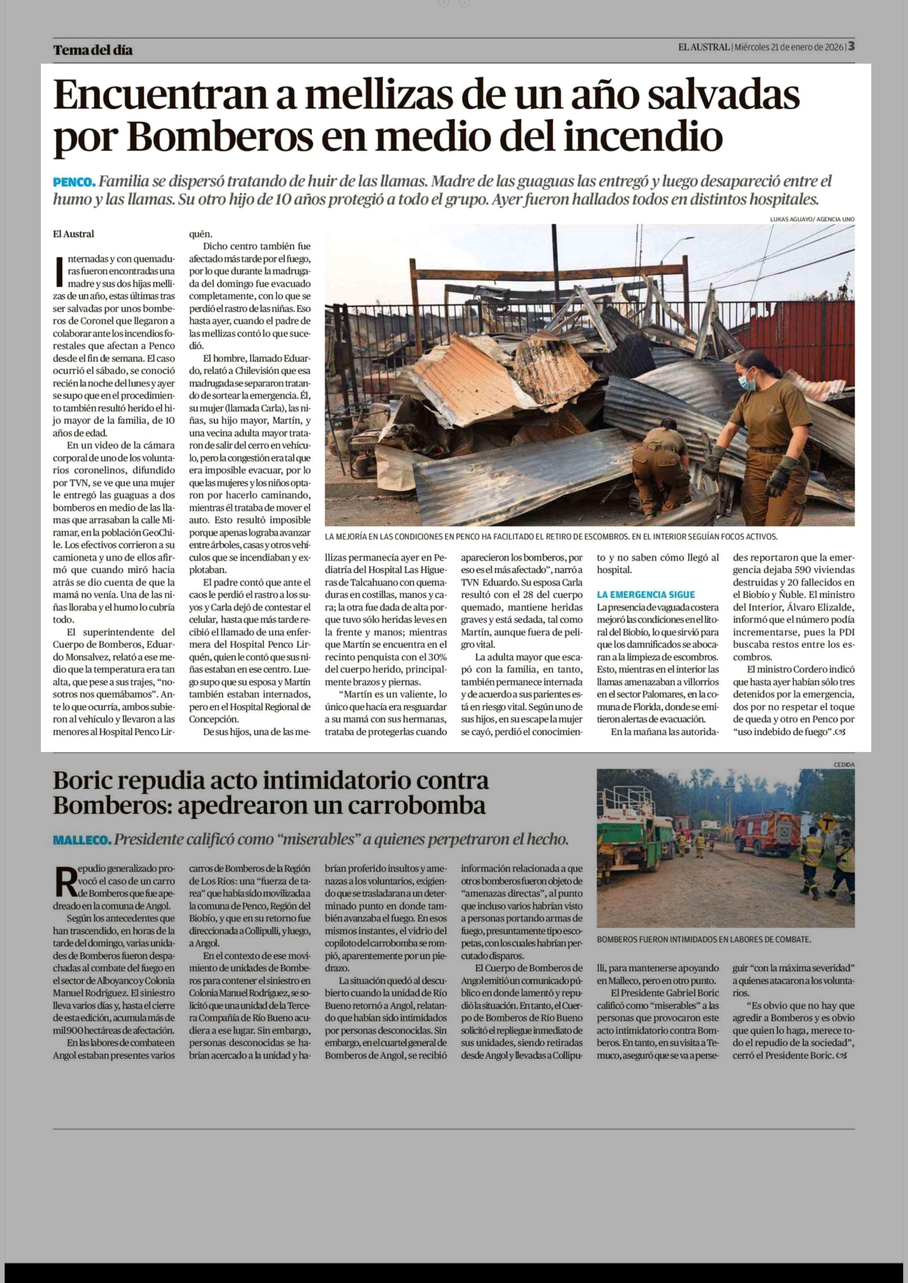 Encuentran a mellizas de un año salvadas por Bomberos en medio del incendio 21-01-2026 El Austral de la Araucanía |