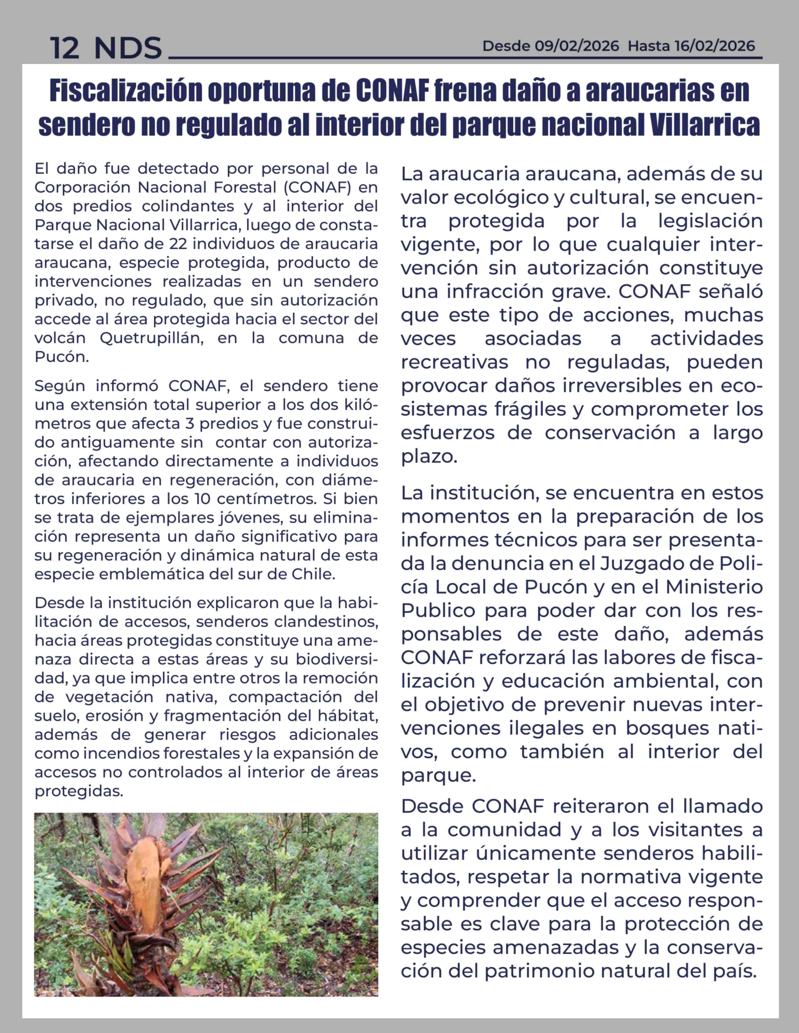 Fiscalización oportuna de CONAF frena daño a araucarias en sendero no regulado al interior del parque nacional Villarrica 09-02-2026 Noticias del Sur |