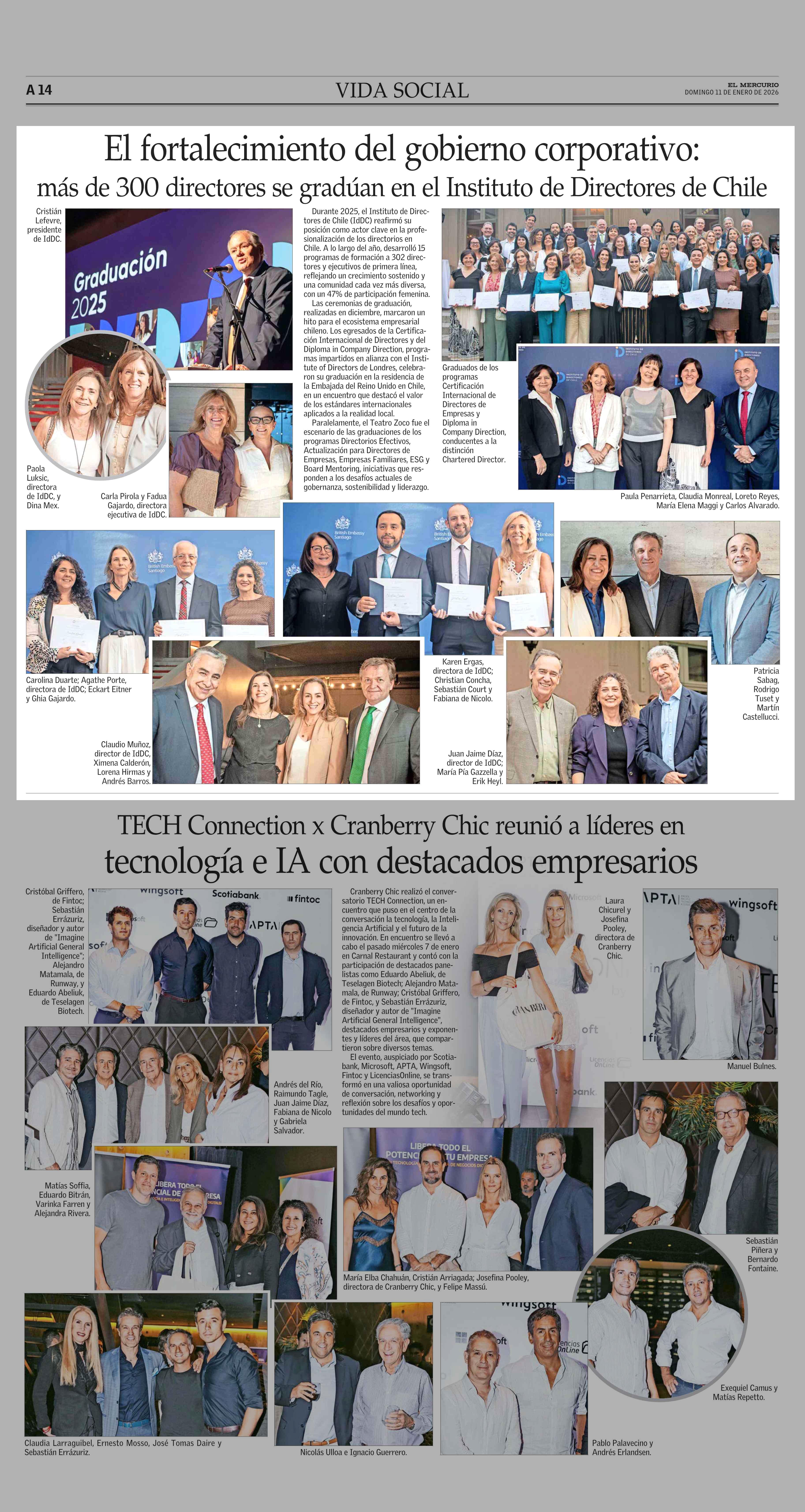 El fortalecimiento del gobierno corporativo: más de 300 directores se gradúan en el Instituto de Directores de Chile 11-01-2026 El Mercurio |
