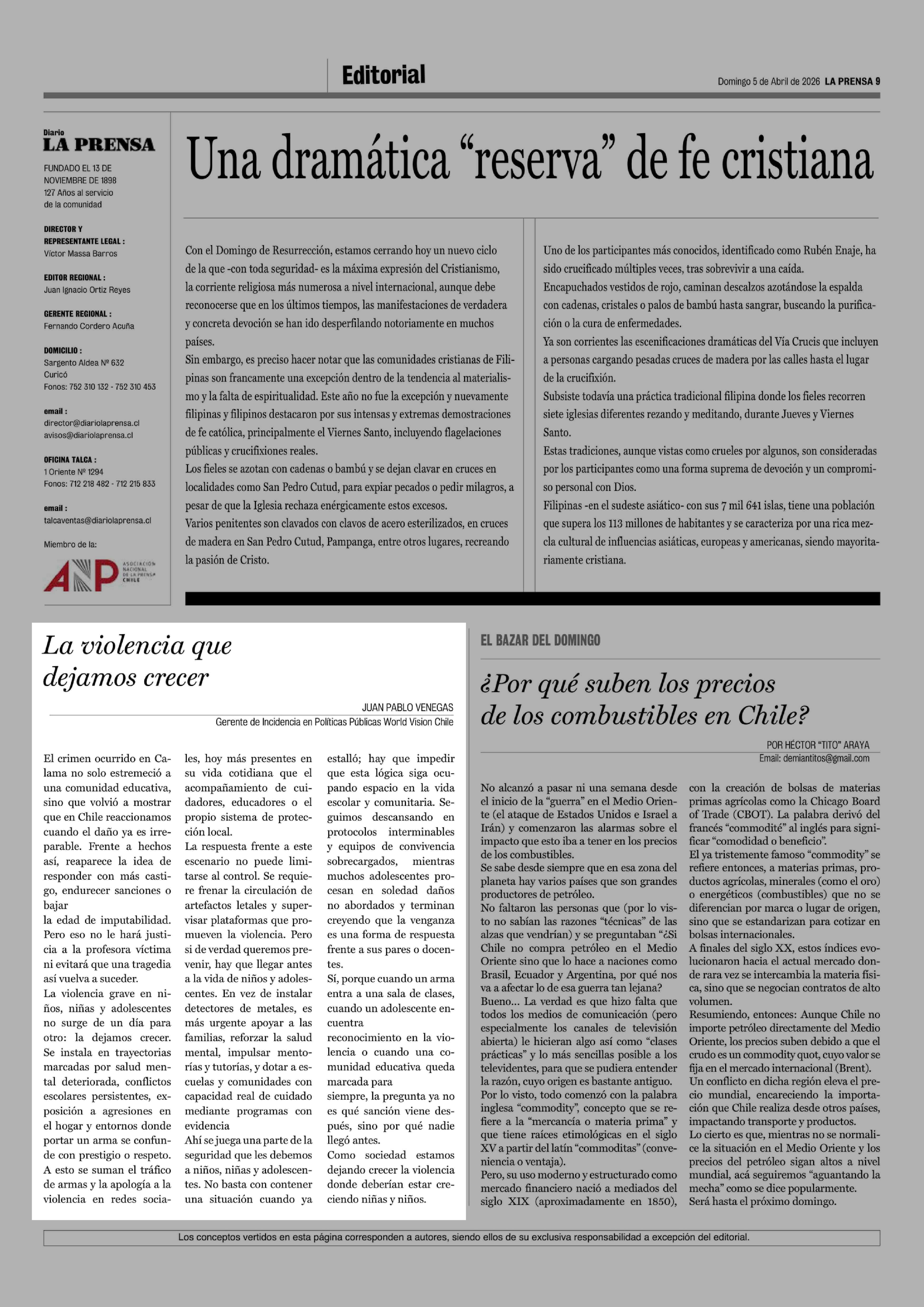 Columnas de Opinión: La violencia que dejamos crecer 05-04-2026 La Prensa de Curicó |