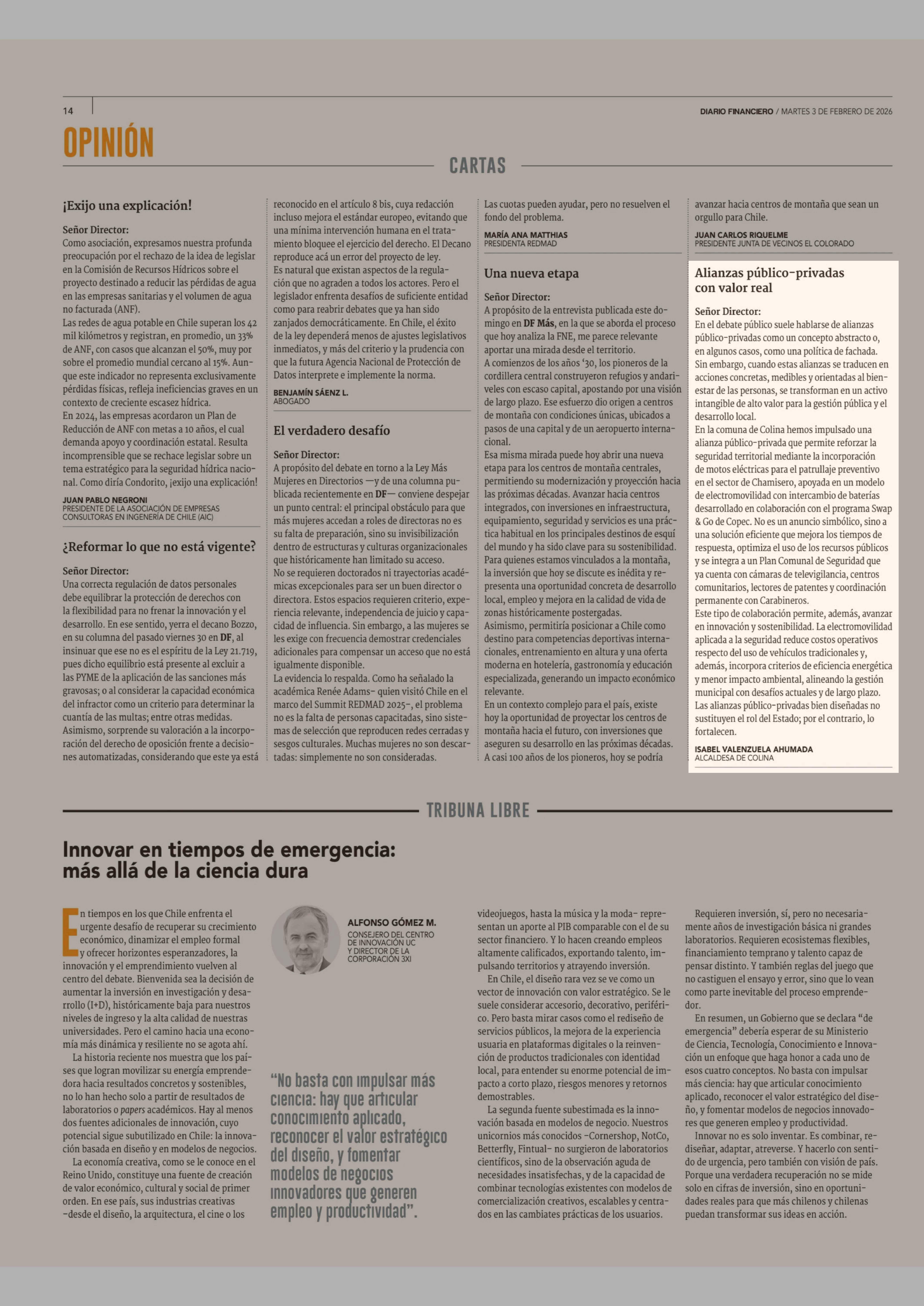 Cartas: Alianzas público-privadas con valor real 03-02-2026 Diario Financiero |