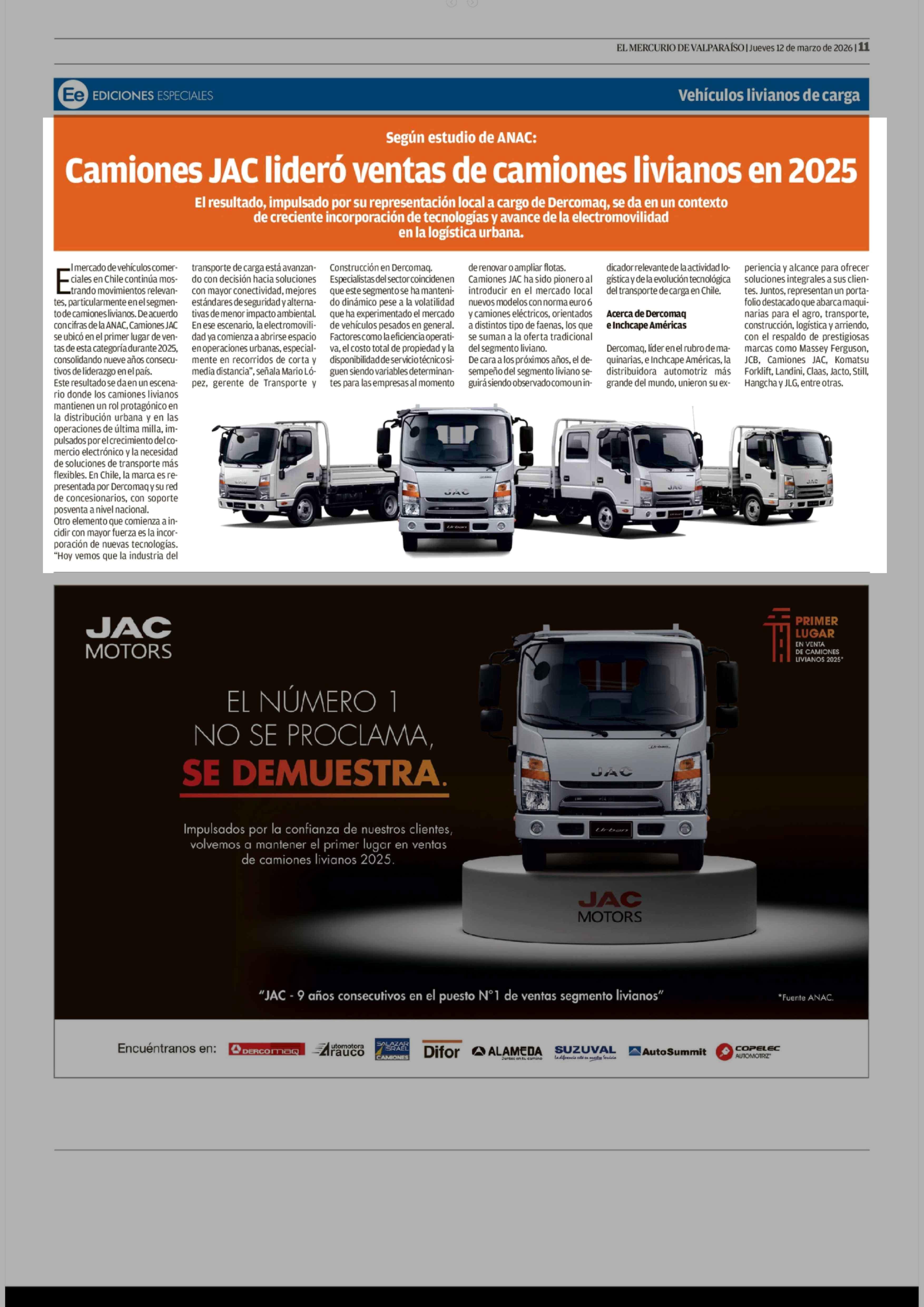 Camiones JAC lideró ventas de camiones livianos en 2025 12-03-2026 El Mercurio de Valparaíso |