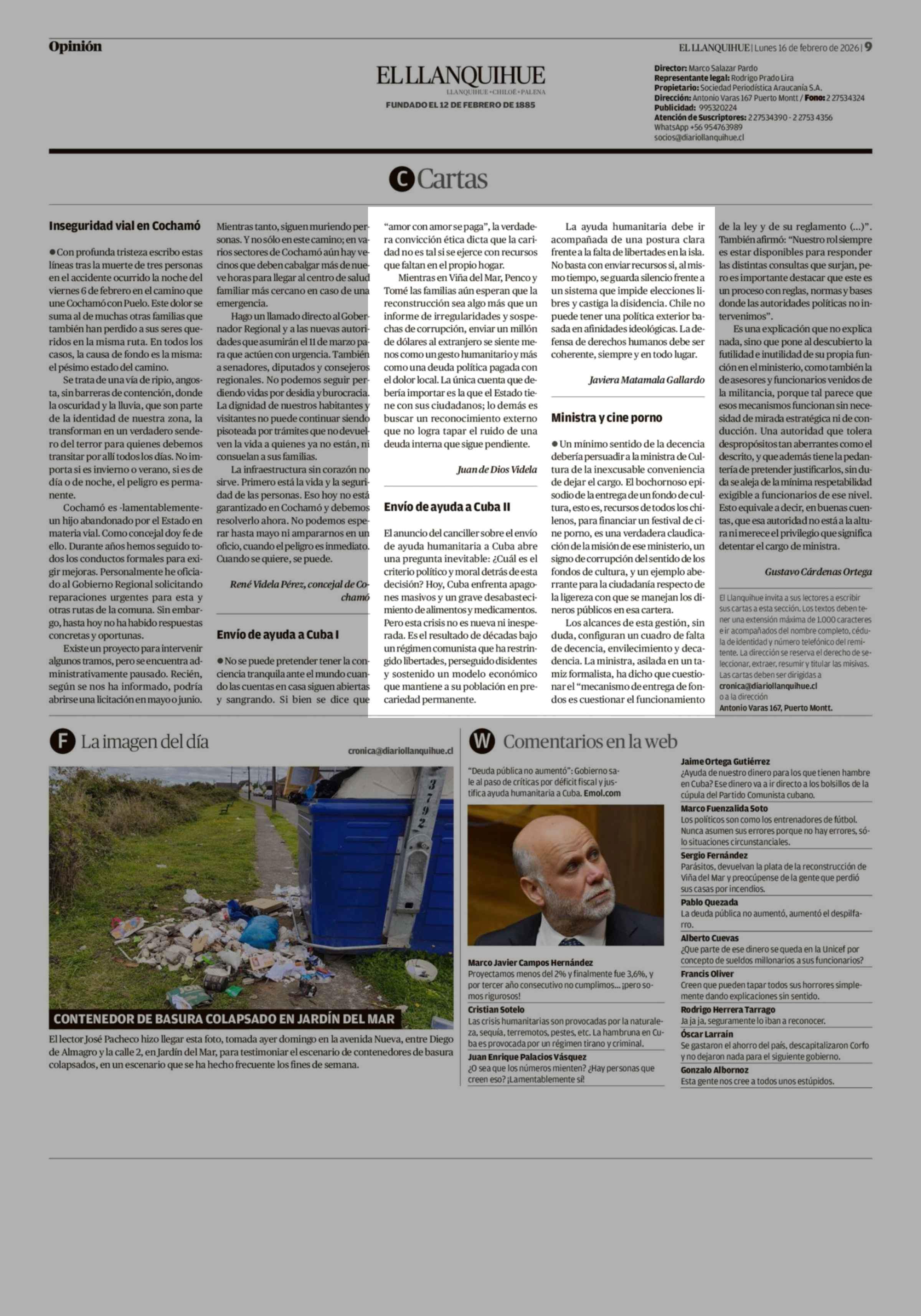 Cartas: Envío de ayuda a Cuba Il 16-02-2026 El Llanquihue |