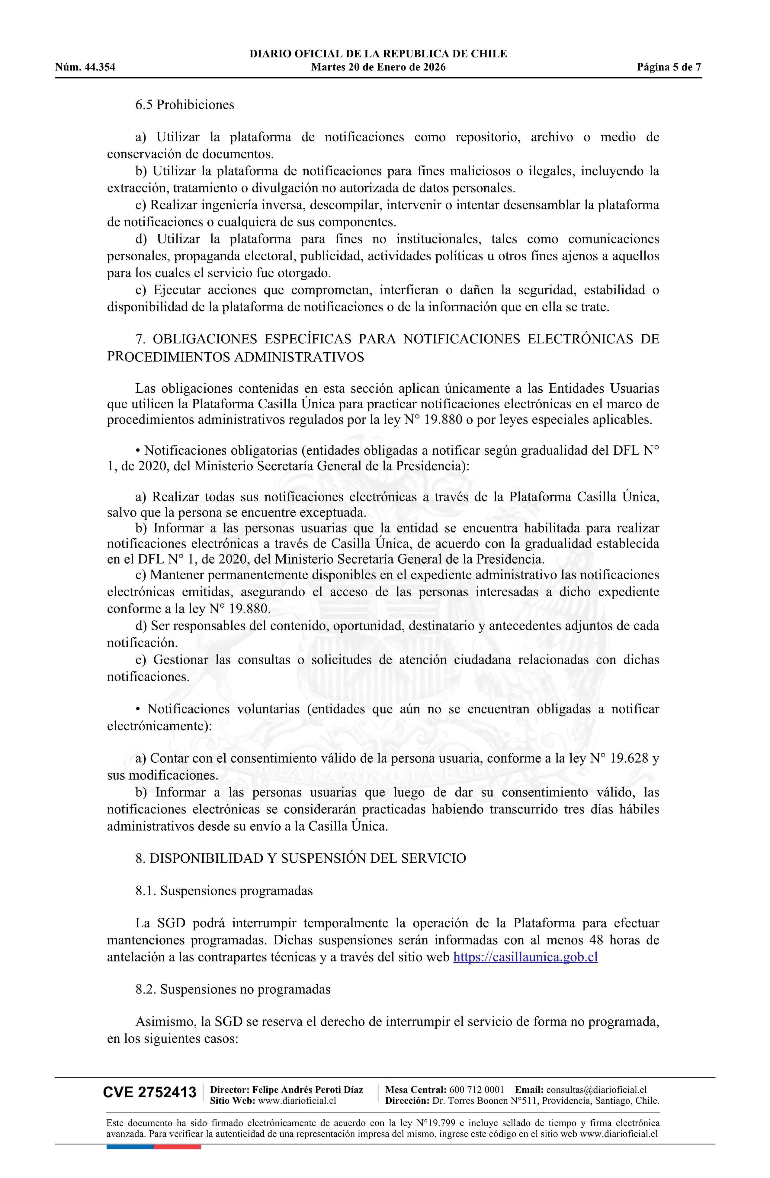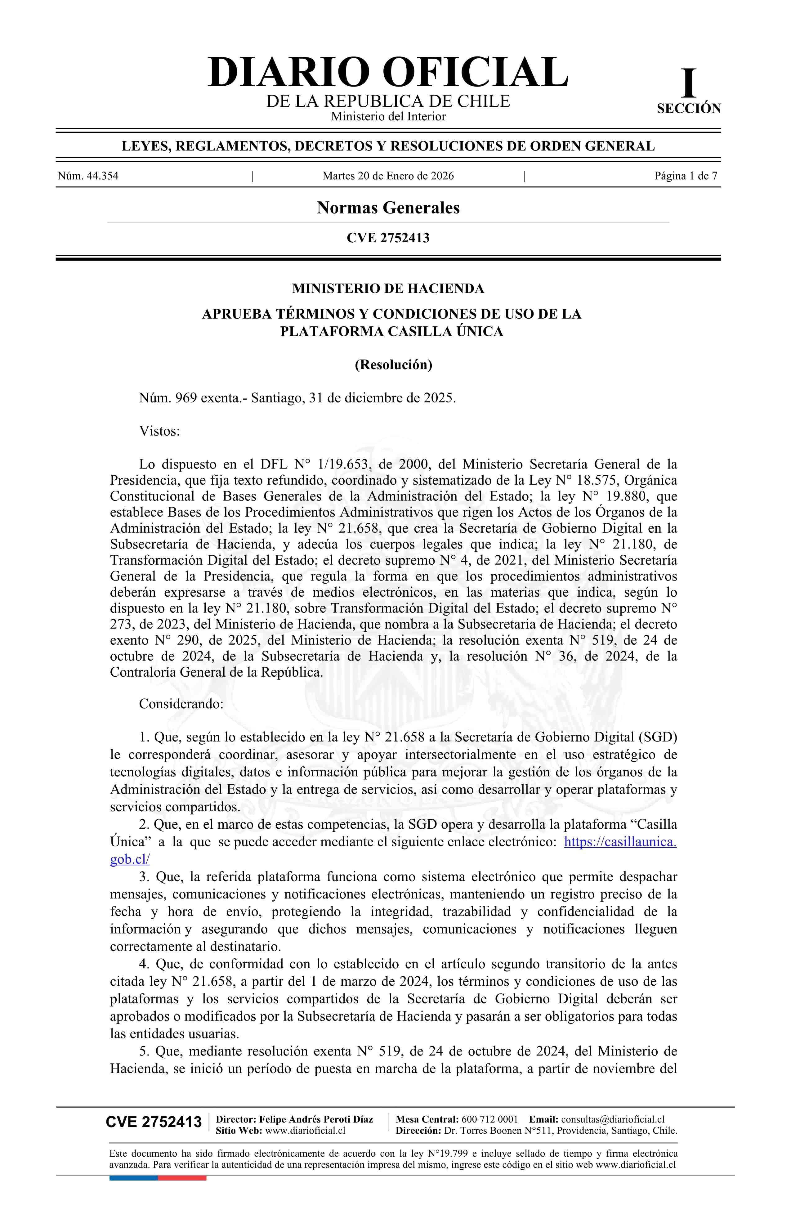 Resolución exenta número 969, de 2025.- Aprueba términos y condiciones de uso de la plataforma Casilla Única 20-01-2026 Diario Oficial Edición Electrónica |