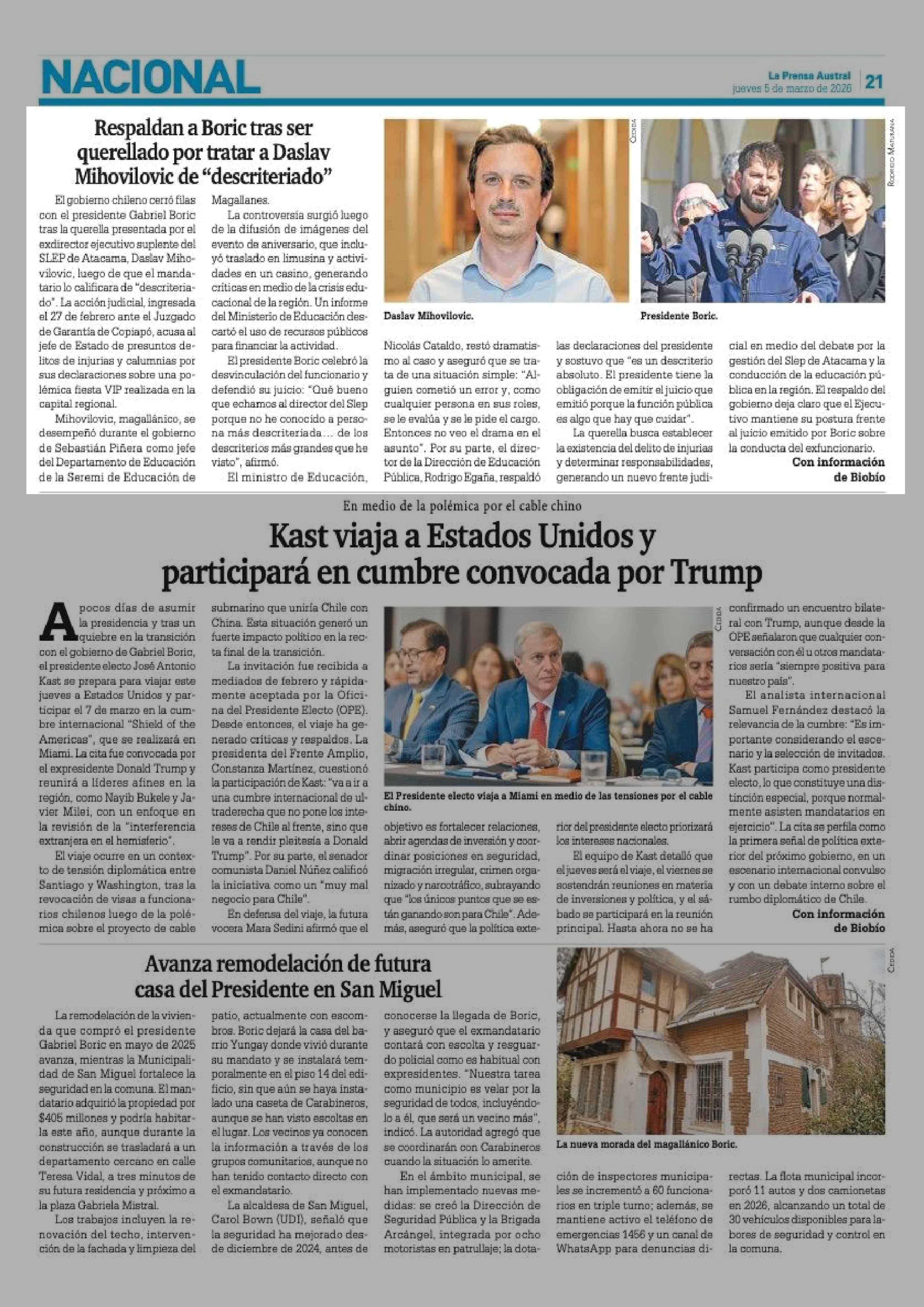 Respaldan a Boric tras ser querellado por tratar a Daslav Mihovilovic de "descriteriado" 05-03-2026 La Prensa Austral |