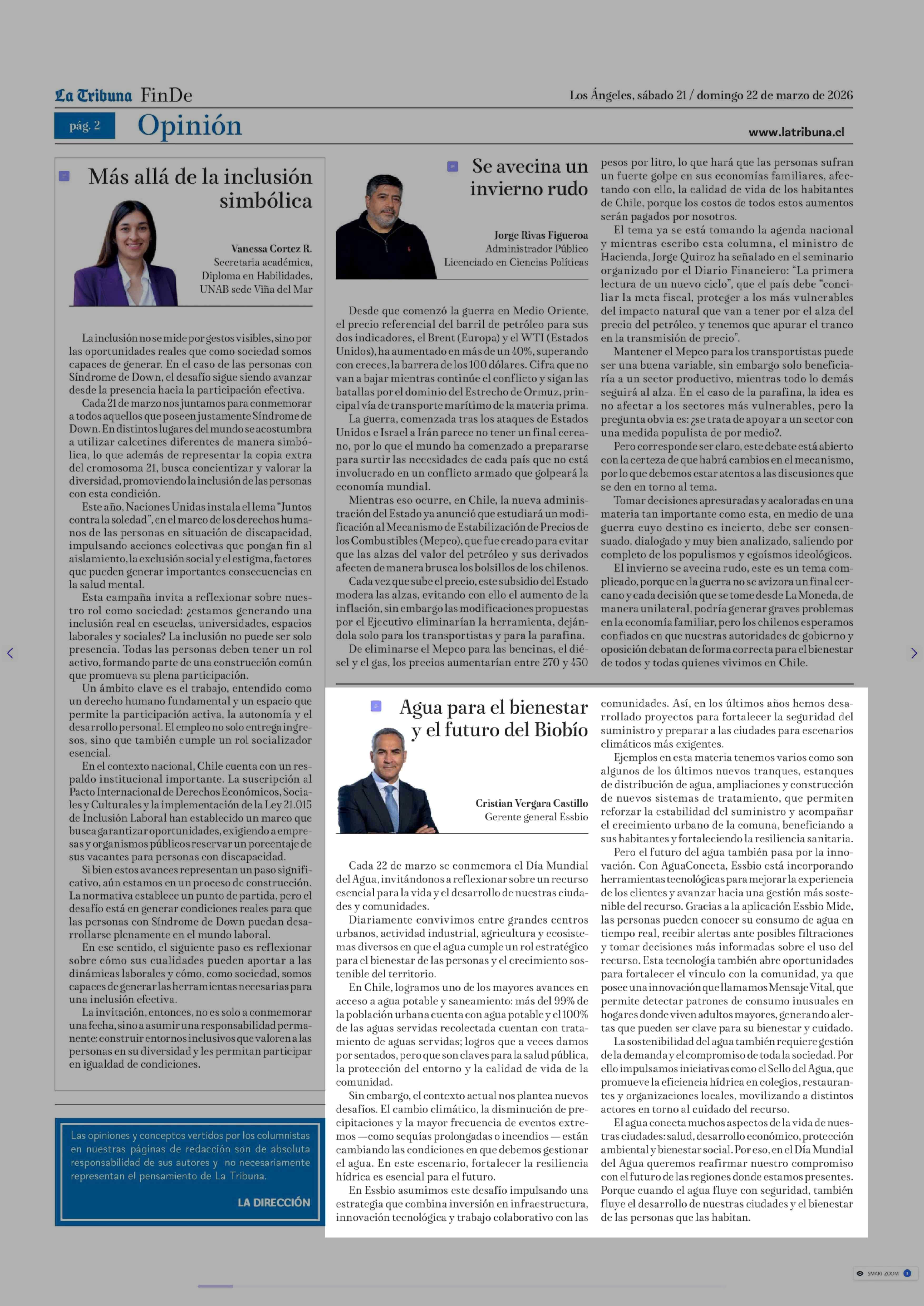 Columnas de Opinión: Agua para el bienestar y el futuro del Biobío 21-03-2026 La Tribuna |