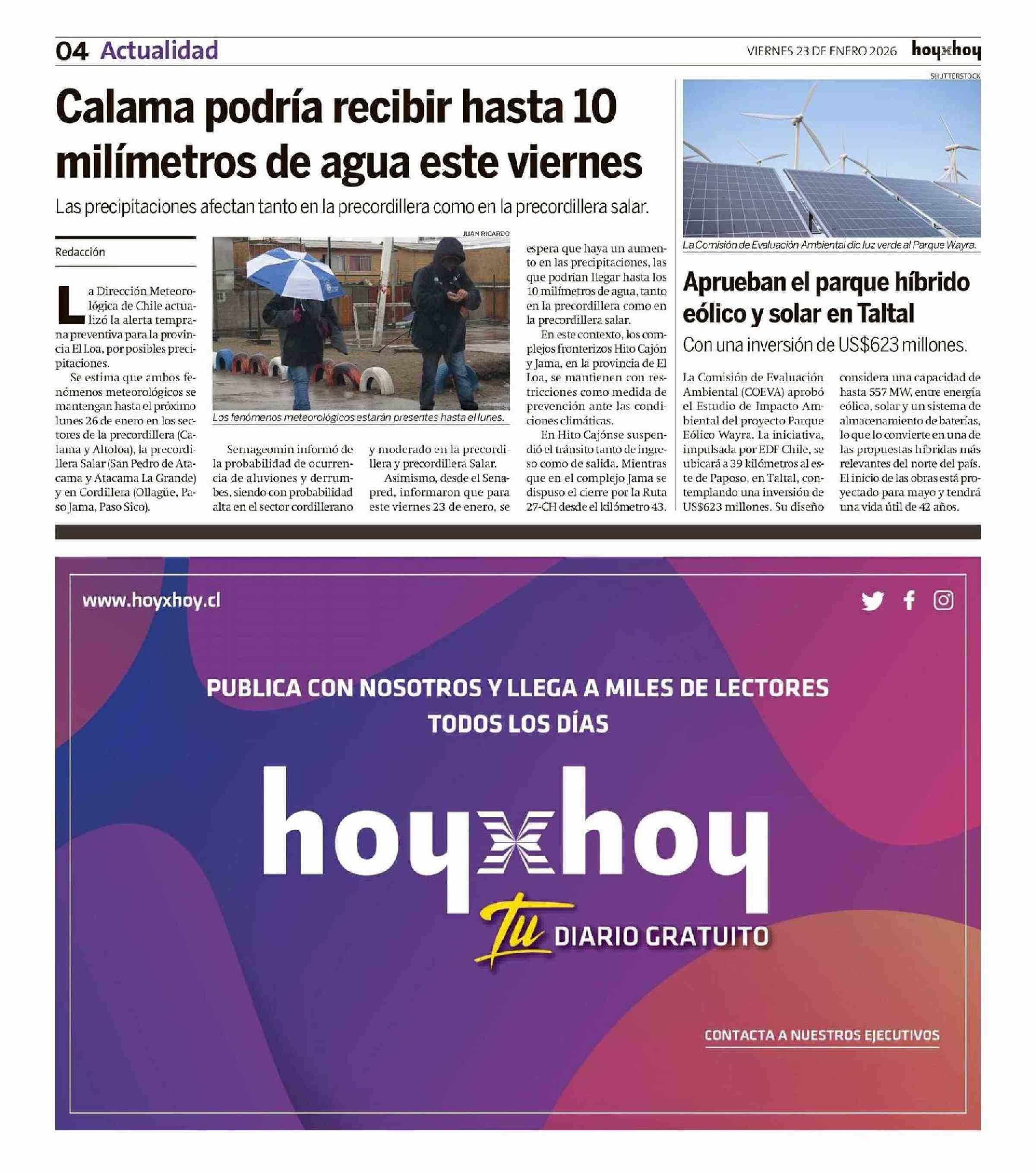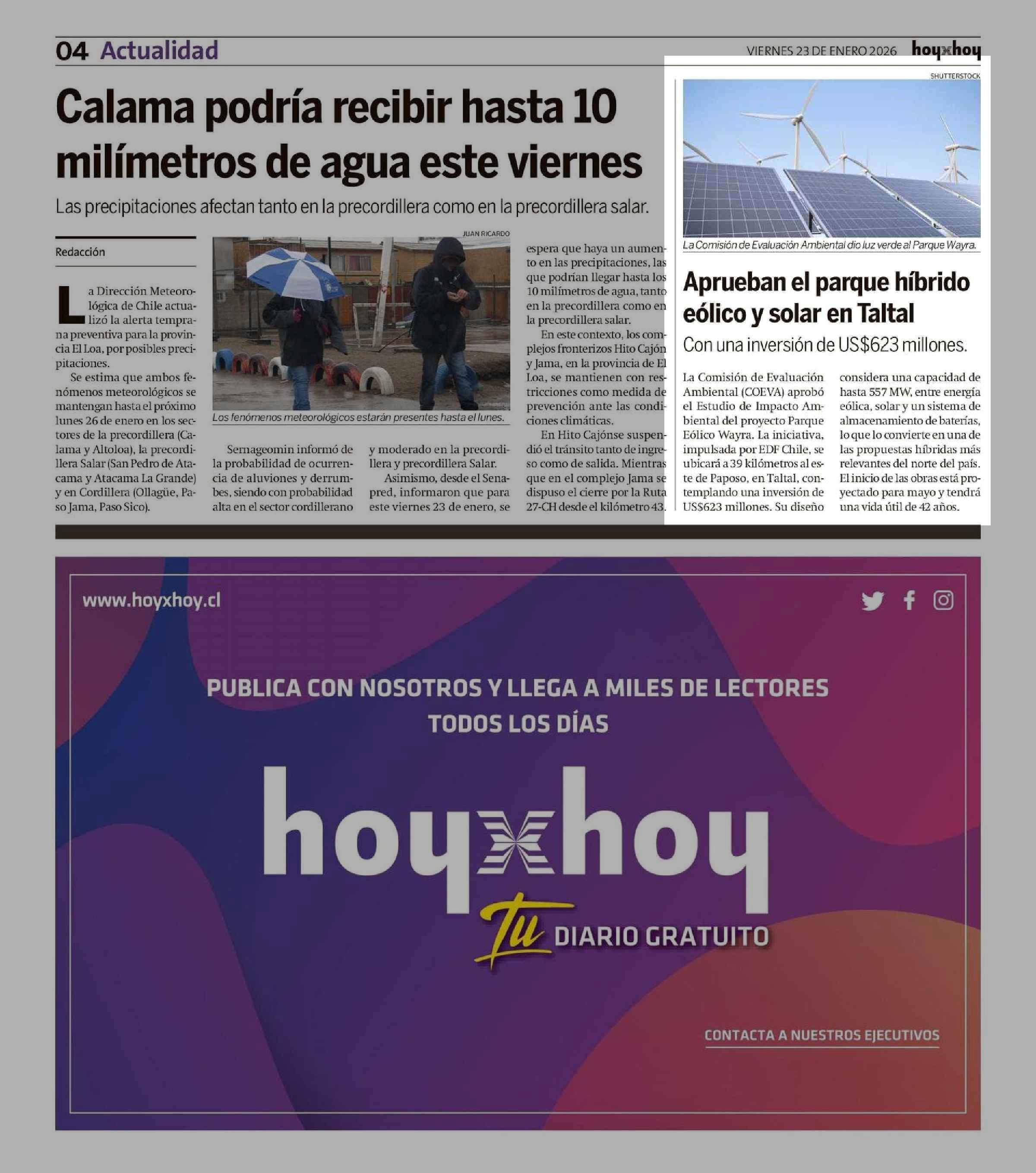Aprueban el parque híbrido eólico y solar en Taltal 23-01-2026 Hoy x Hoy Antofagasta |