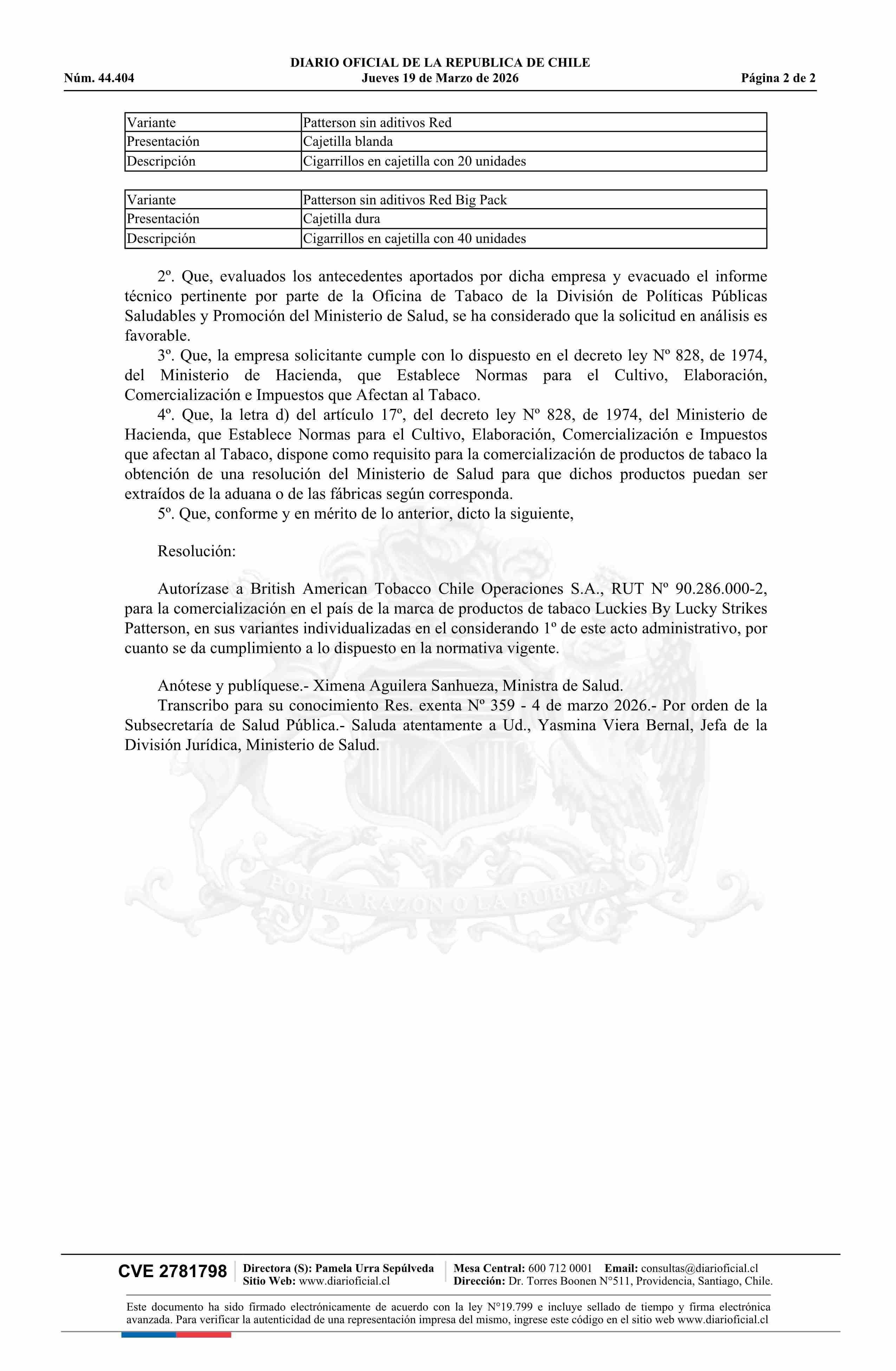 Título: Resolución exenta número 359, de 2026.- Autoriza comercialización de productos de tabaco que indica comercializados por British American Tobacco Chile Operaciones S.A.