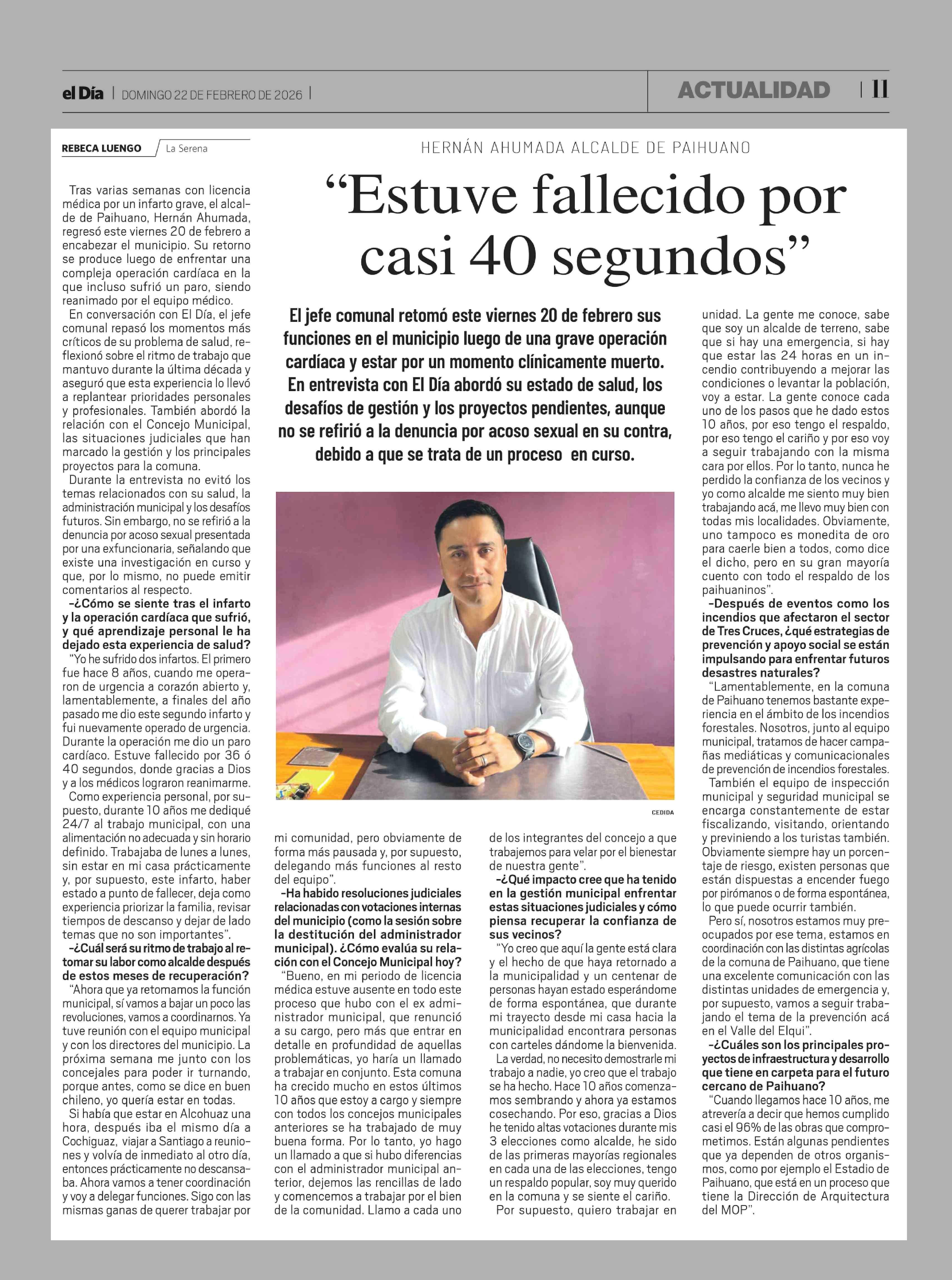"Estuve fallecido por casi 40 segundos" 22-02-2026 El Día |