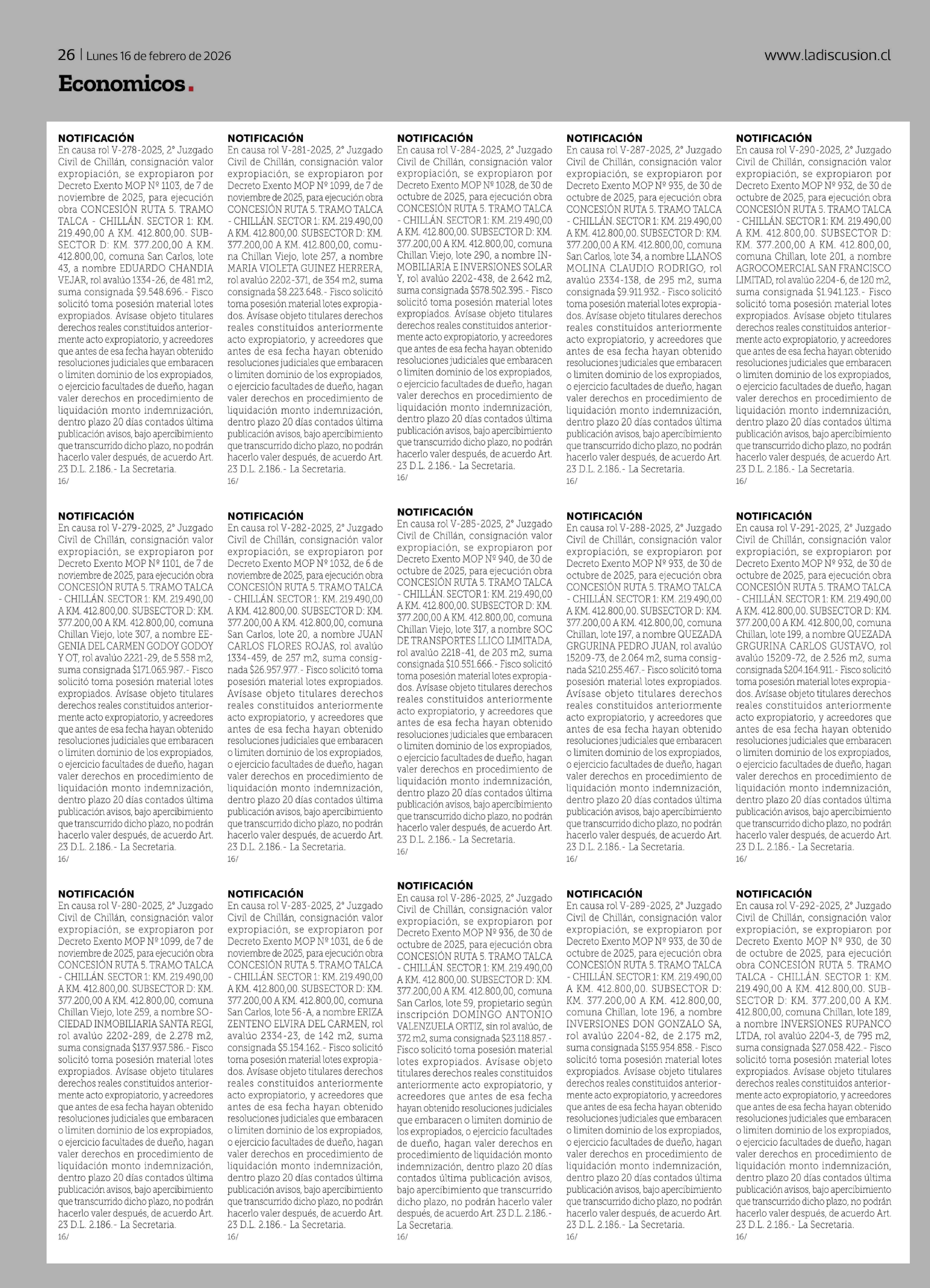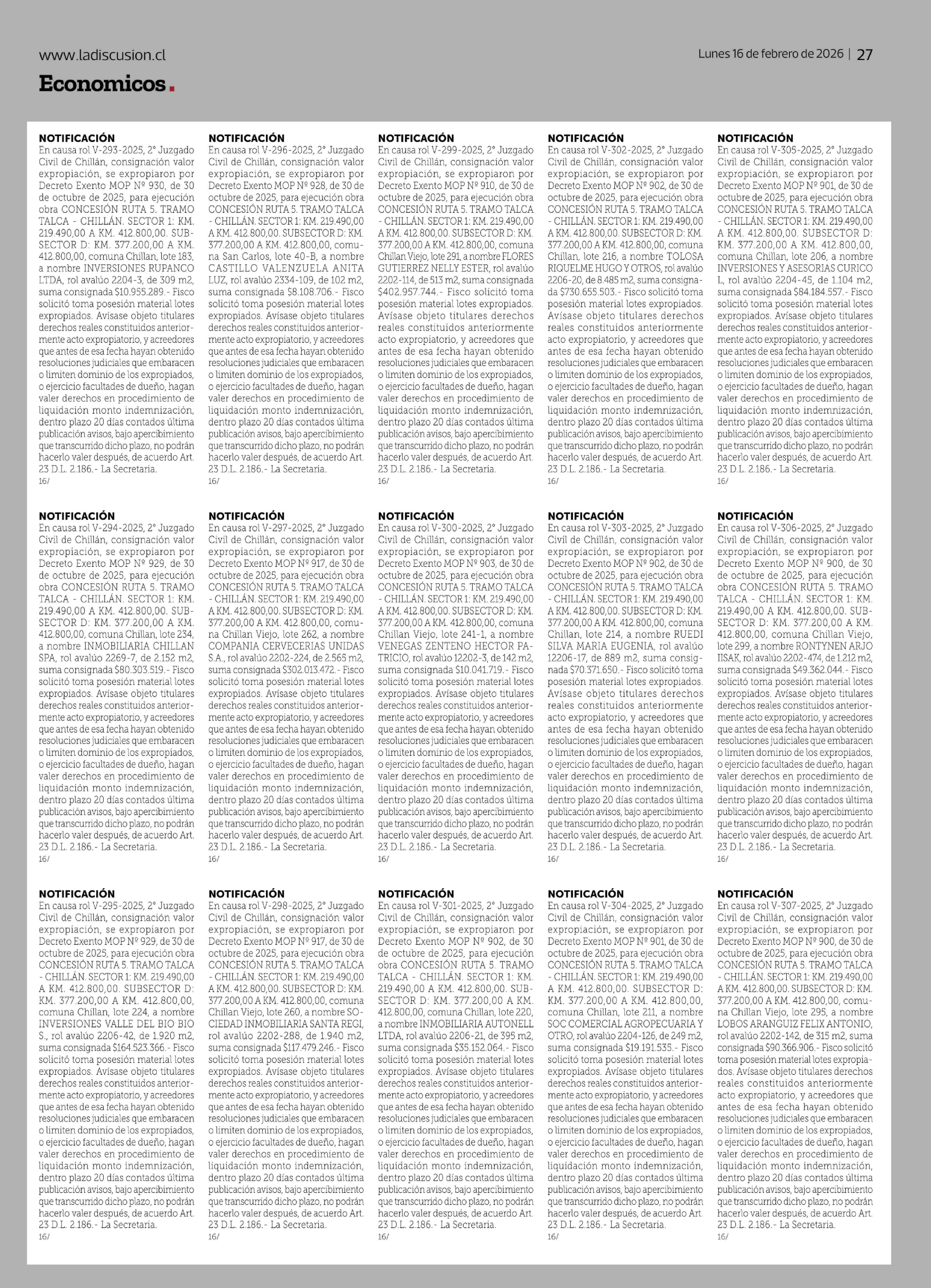 | Título: | NOTIFICACIÓN En causa rol V-279-2025, 2° Juzgado Civil de Chillán, consignación valor expropiación, se expropiaron por Decreto Exento MOP Nº 1101, de 7 de noviembre de 2025, para ejecución obra CONCESIÓN RUTA 5. TRAMO TALCA - CHILLÁN. SECTOR 1: KM. 219.490,00 AKM. 412.800,00. SUBSECTOR D: KM. 377.20 |