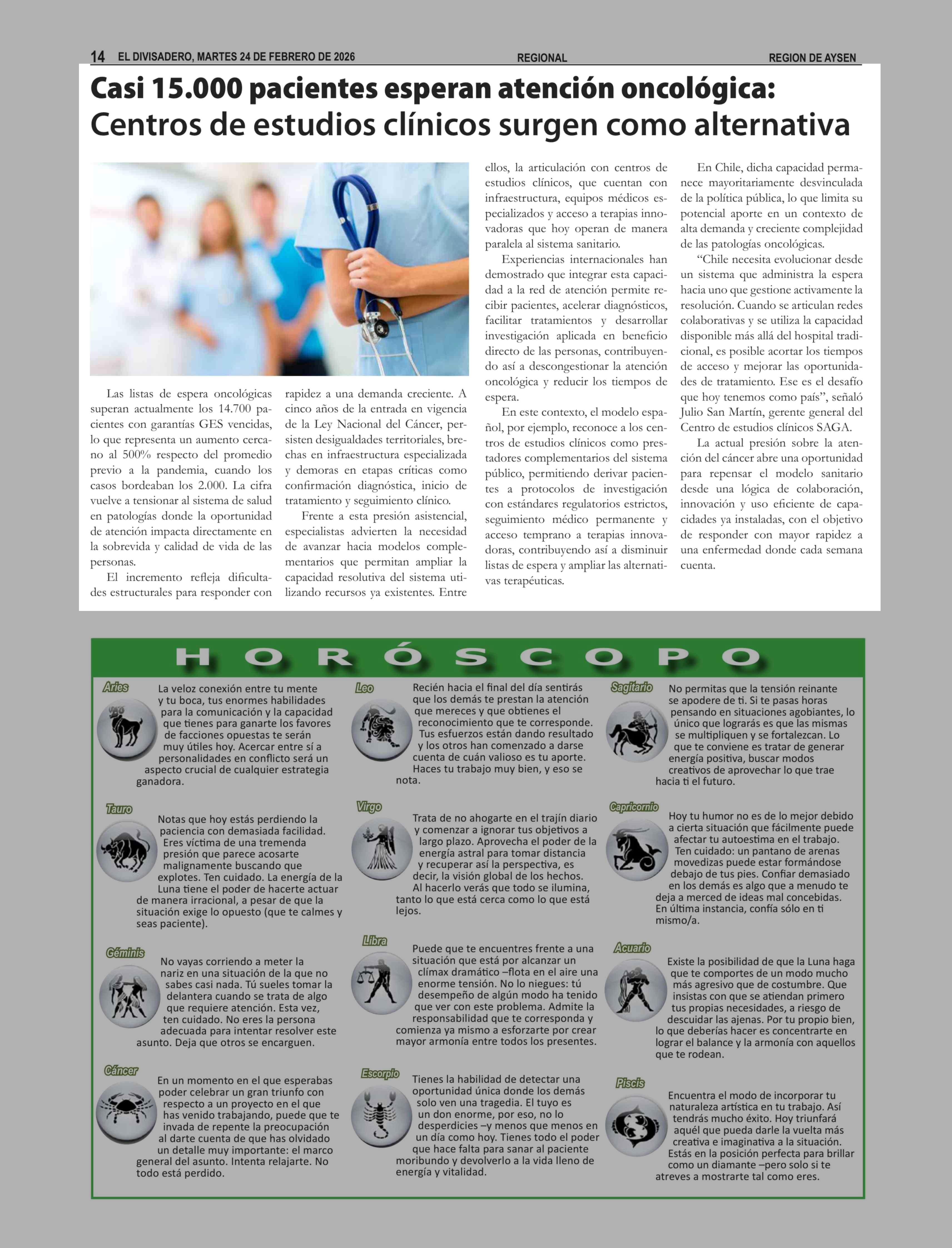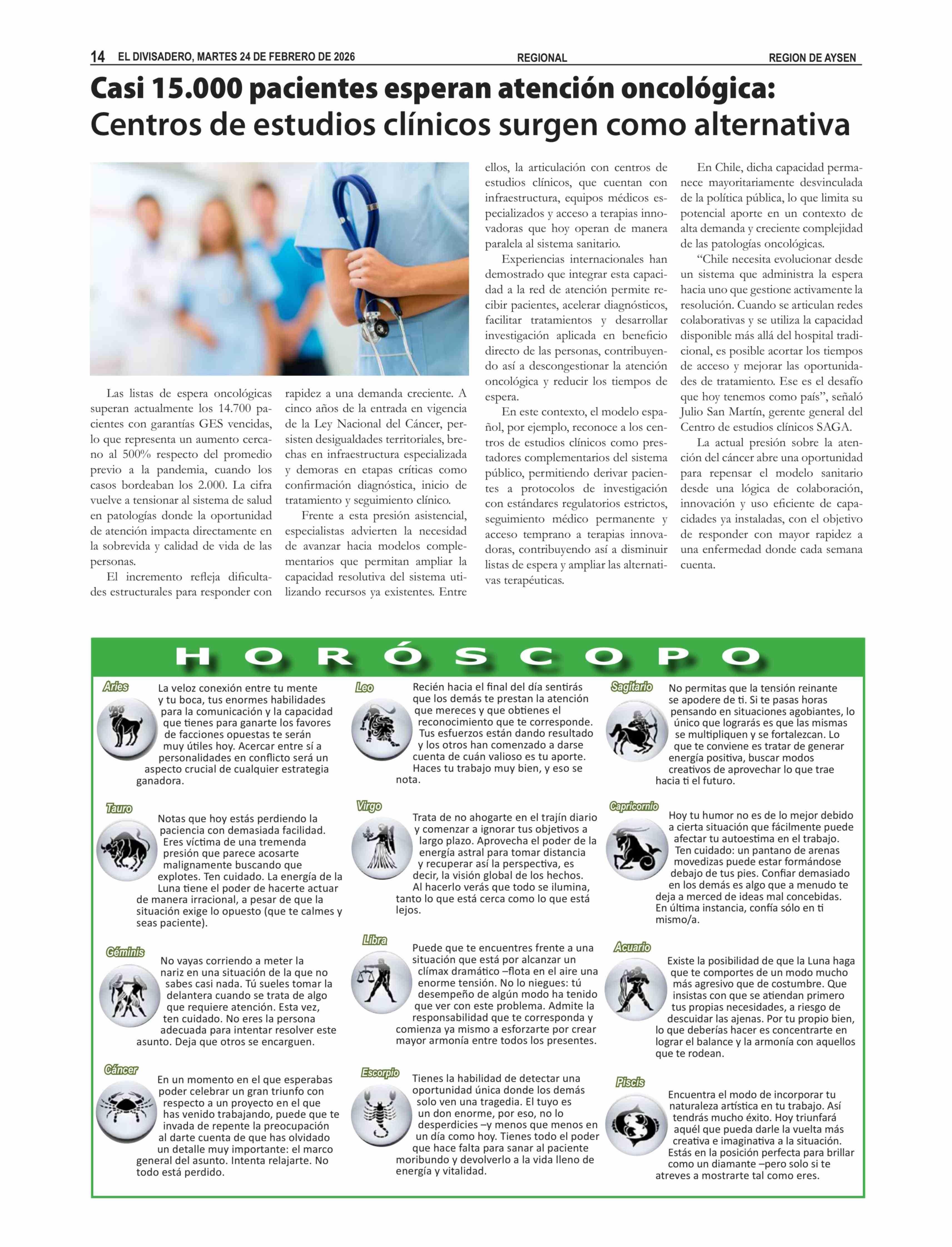 Casi 15.000 pacientes esperan atención oncológica: Centros de estudios clínicos surgen como alternativa 24-02-2026 El Divisadero |