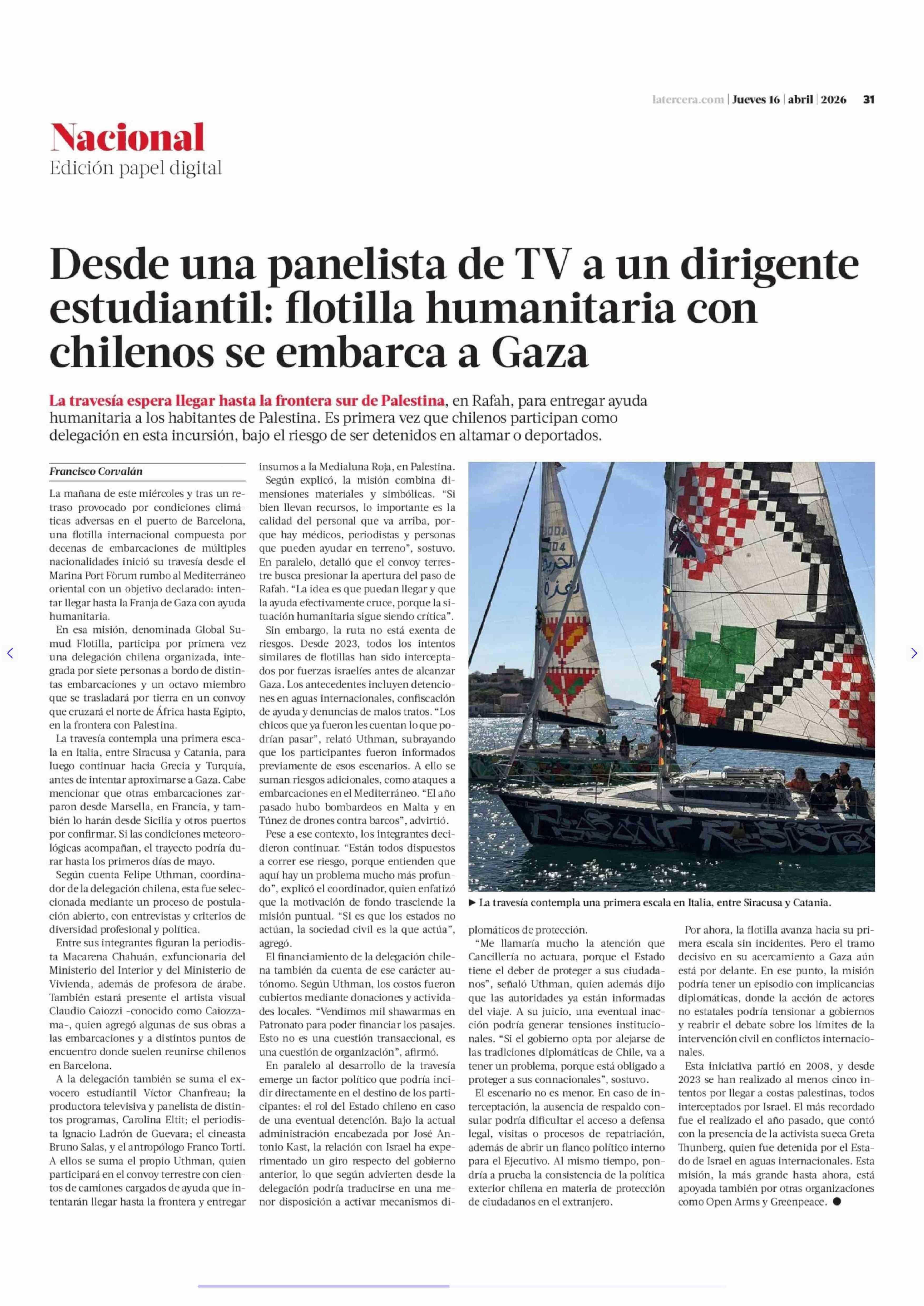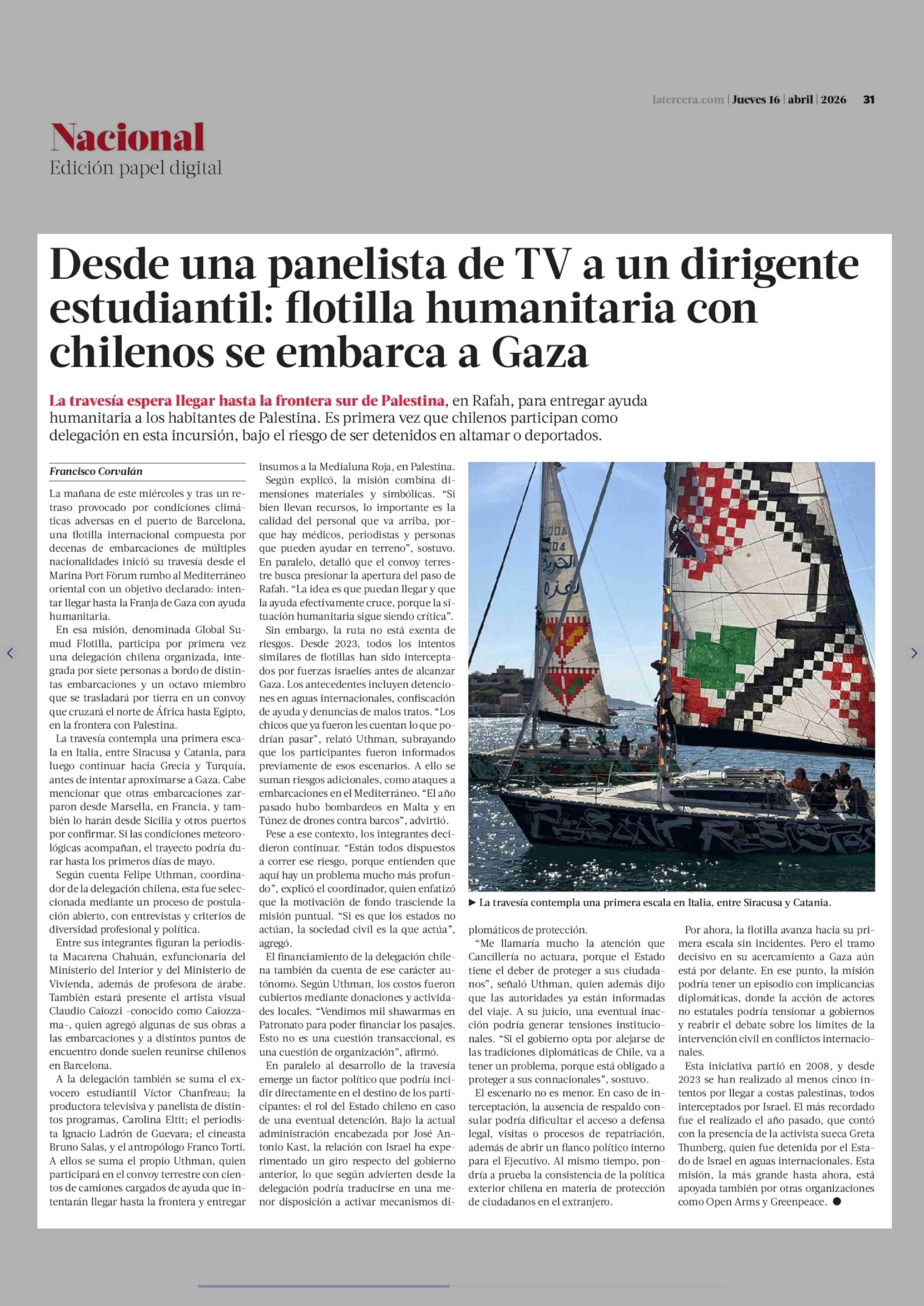 Desde una panelista de TV a un dirigente estudiantil: flotilla humanitaria con chilenos se embarca a Gaza 16-04-2026 La Tercera |