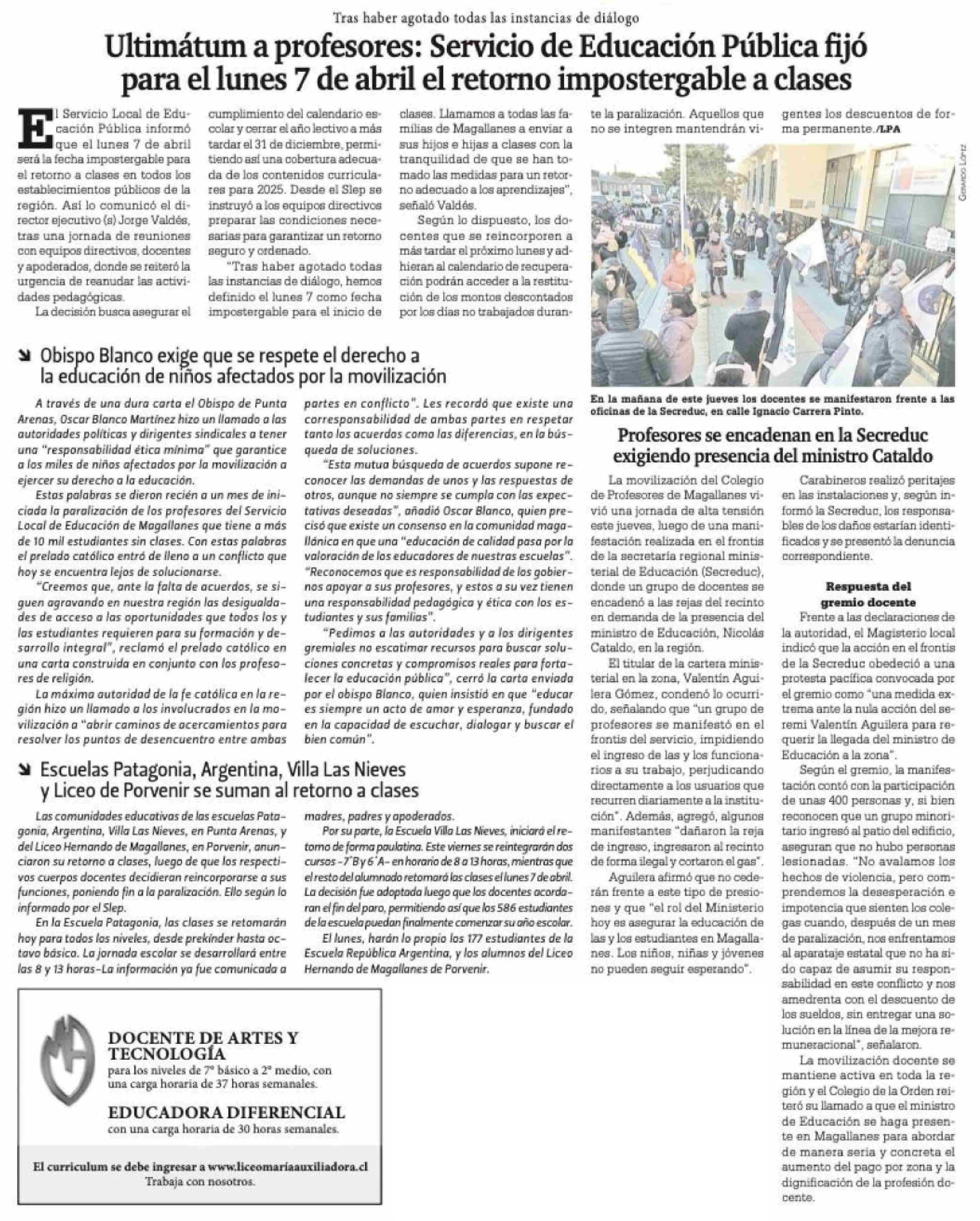 Ultimátum a profesores: Servicio de Educación Pública fijó para el lunes 7 de abril el retorno impostergable a clases 04-04-2025 La Prensa Austral |