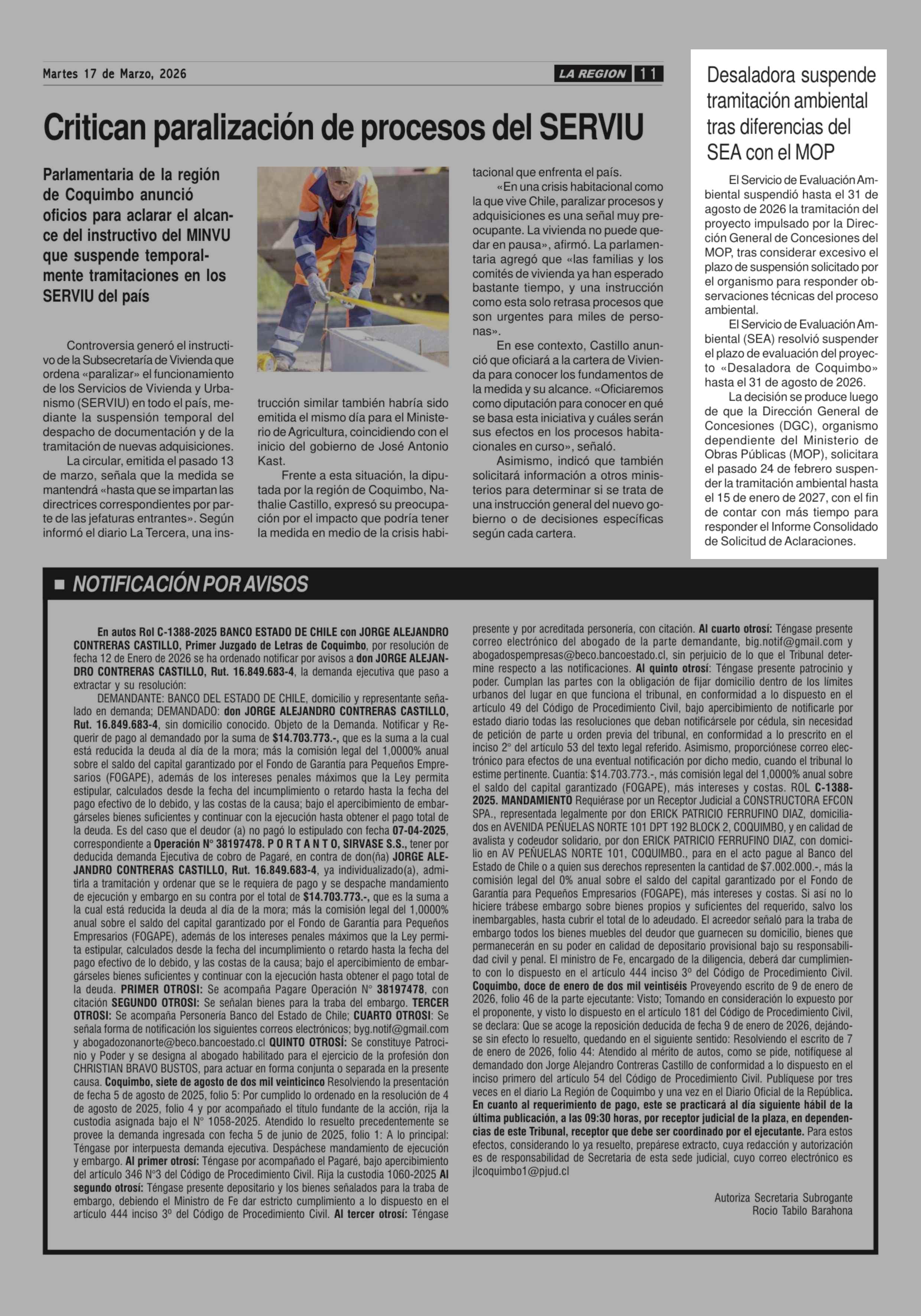Desaladora suspende tramitación ambiental tras diferencias del SEA con el MOP 17-03-2026 Diario la Región |