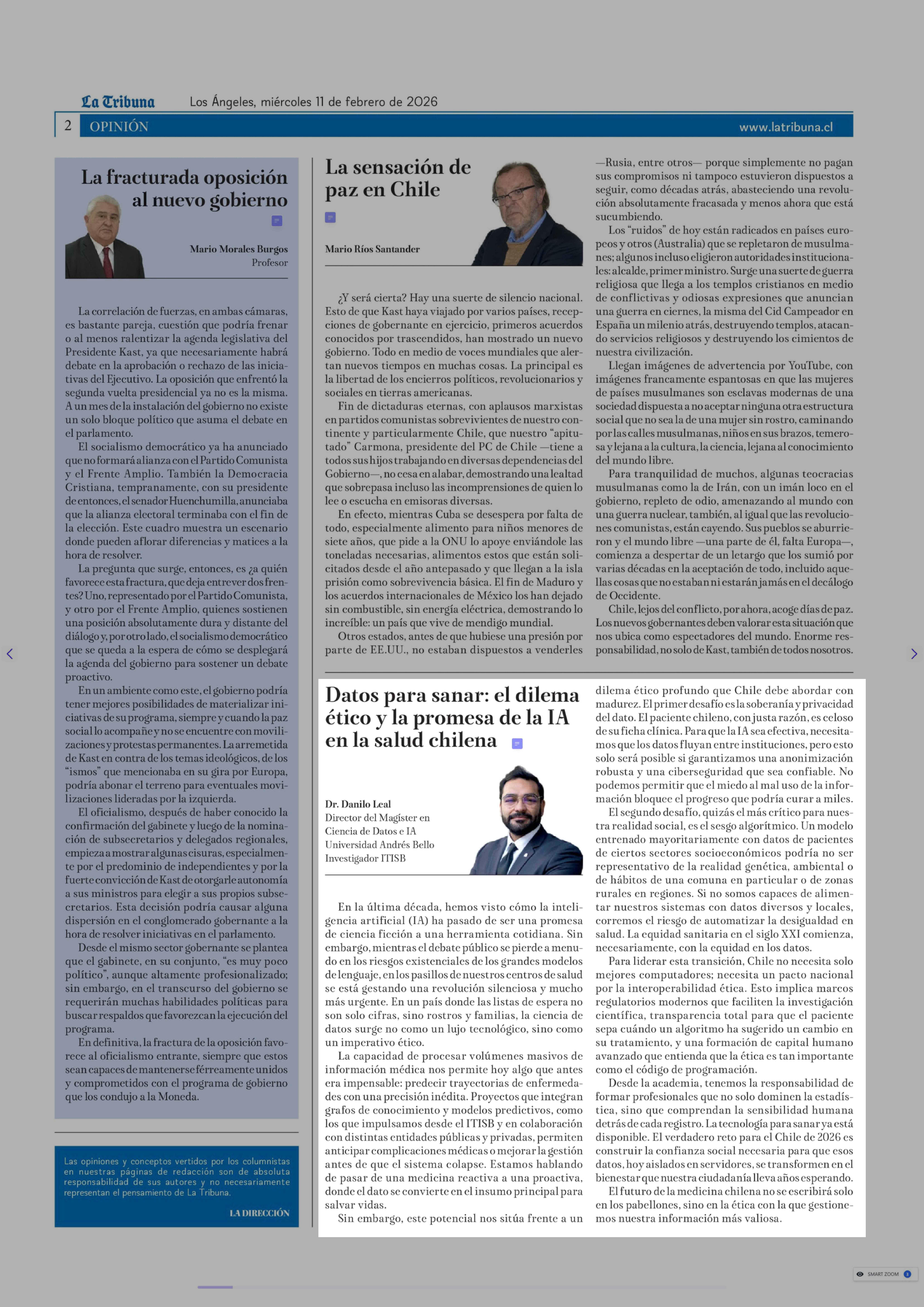 Columnas de Opinión: Datos para sanar: el dilema ético y la promesa de la IA en la salud chilena 11-02-2026 La Tribuna |