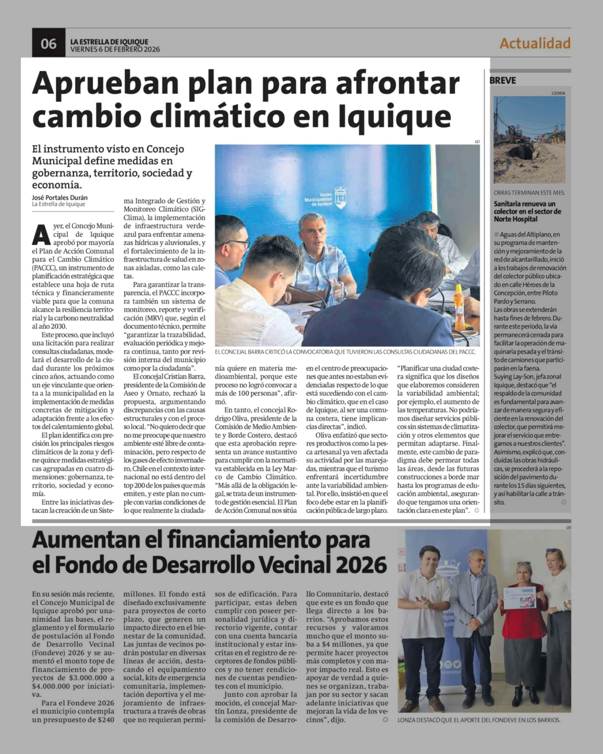 Aprueban plan para afrontar cambio climático en Iquique 06-02-2026 La Estrella de Iquique |