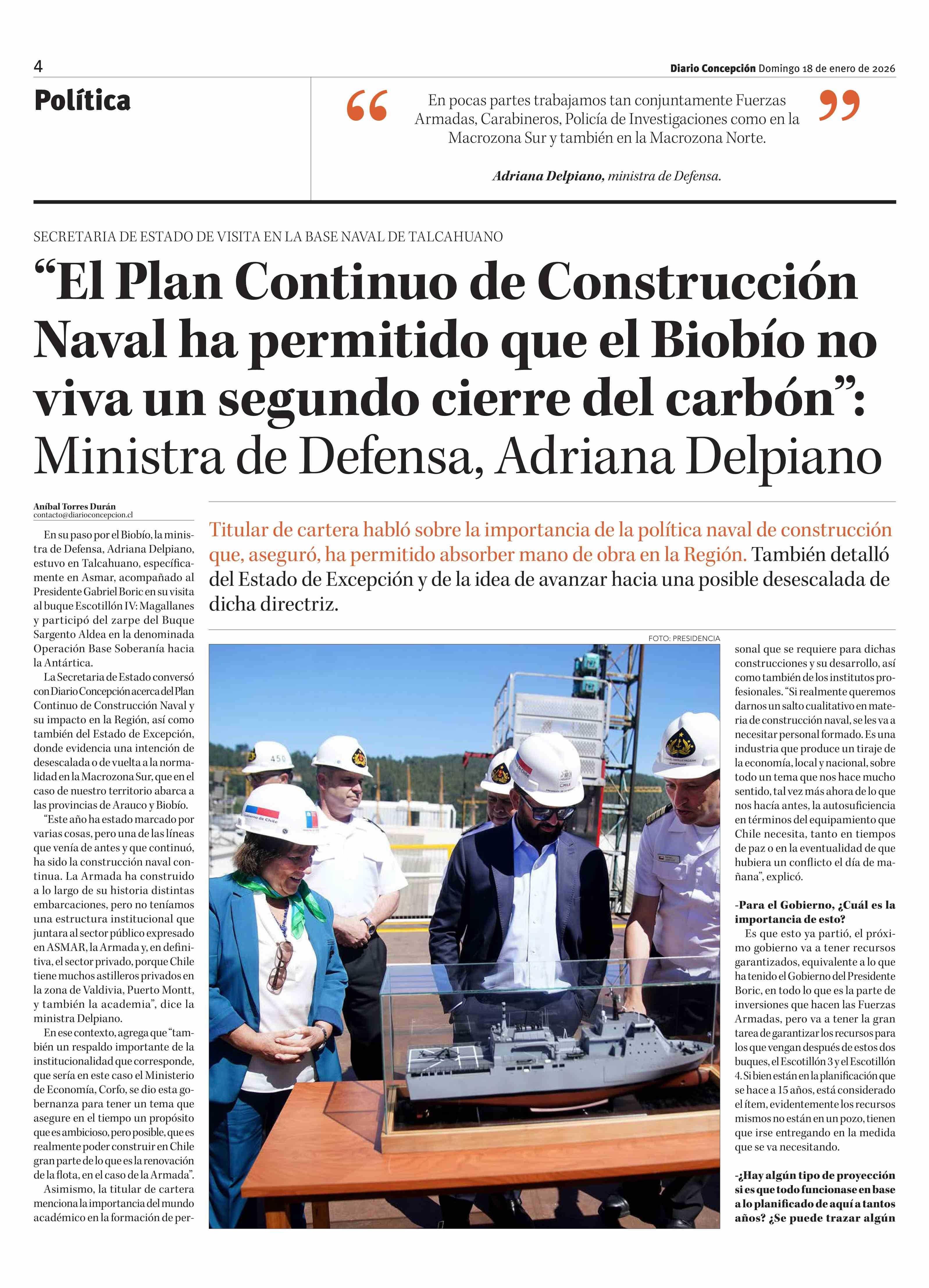 "El Plan Continuo de Construcción Naval ha permitido que el Biobío no viva un segundo cierre del carbón": Ministra de Defensa, Adriana Delpiano 18-01-2026 Diario Concepción |