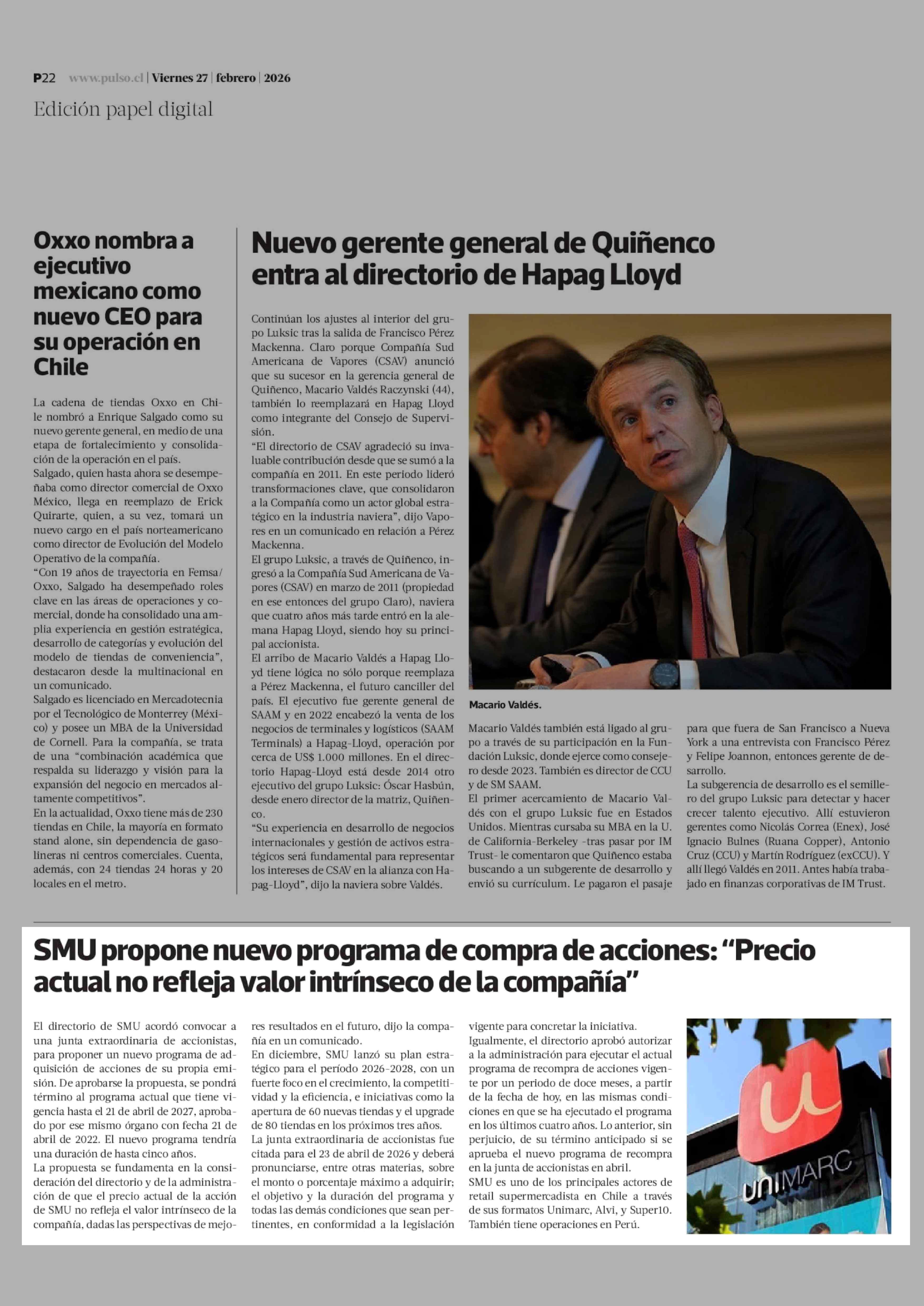 SMU propone nuevo programa de compra de acciones: "Precio actual no refleja valor intrínseco de la compañía" 27-02-2026 La Tercera |