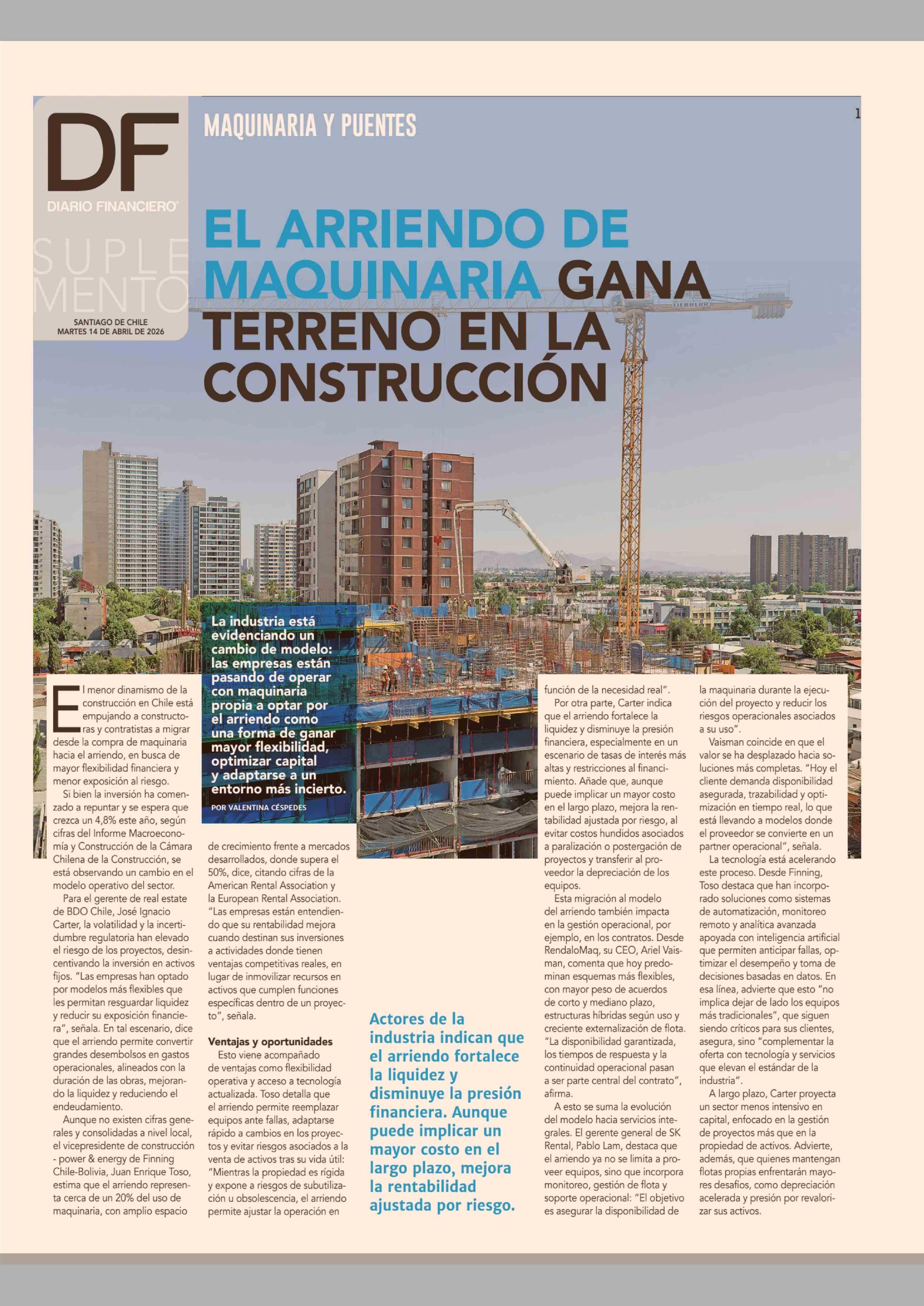 EL ARRIENDO DE MAQUINARIA GANA TERRENO EN LA CONSTRUCCIÓN 14-04-2026 Diario Financiero |