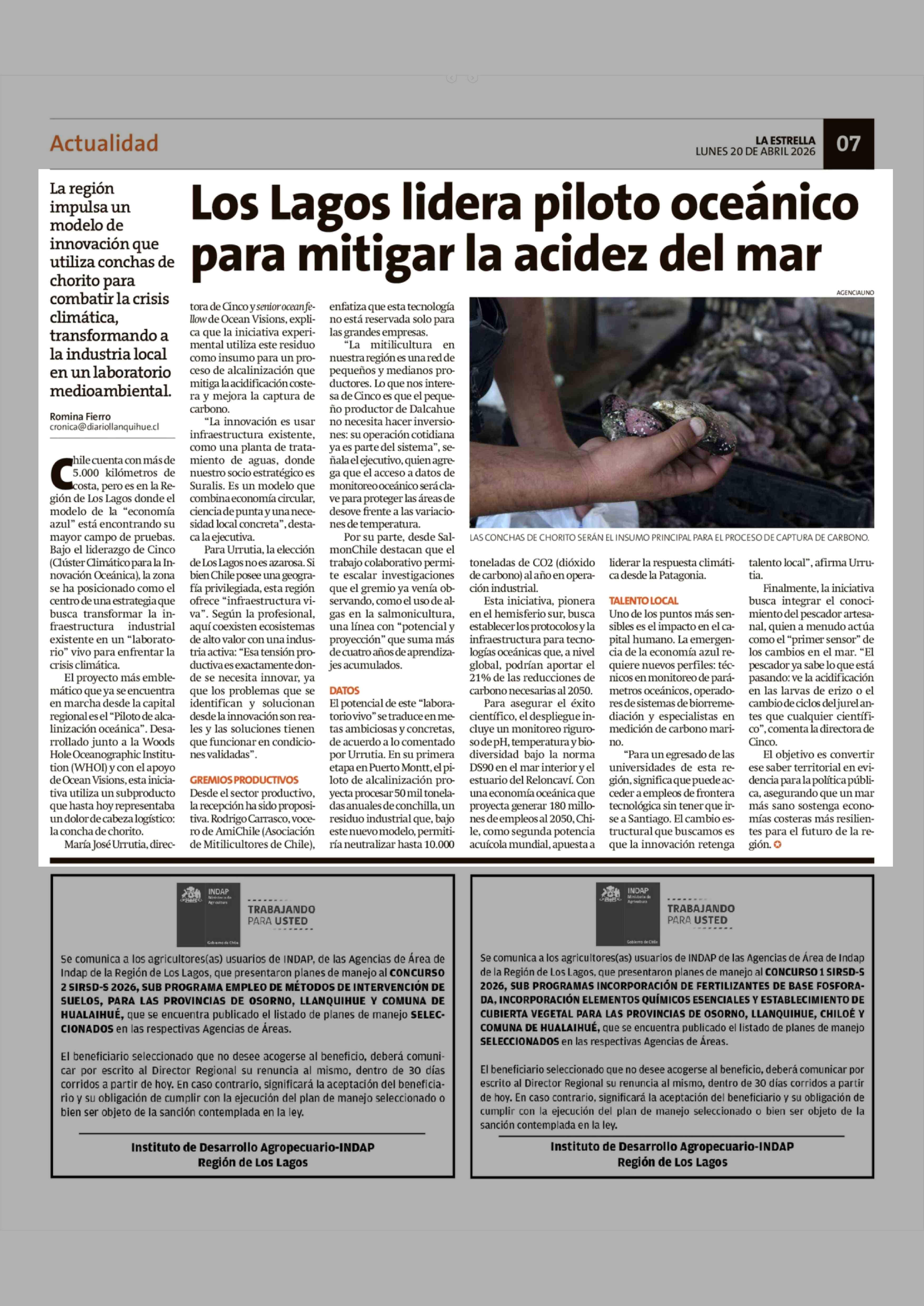 Los Lagos lidera piloto oceánico para mitigar la acidez del mar 20-04-2026 La Estrella de Chiloé |