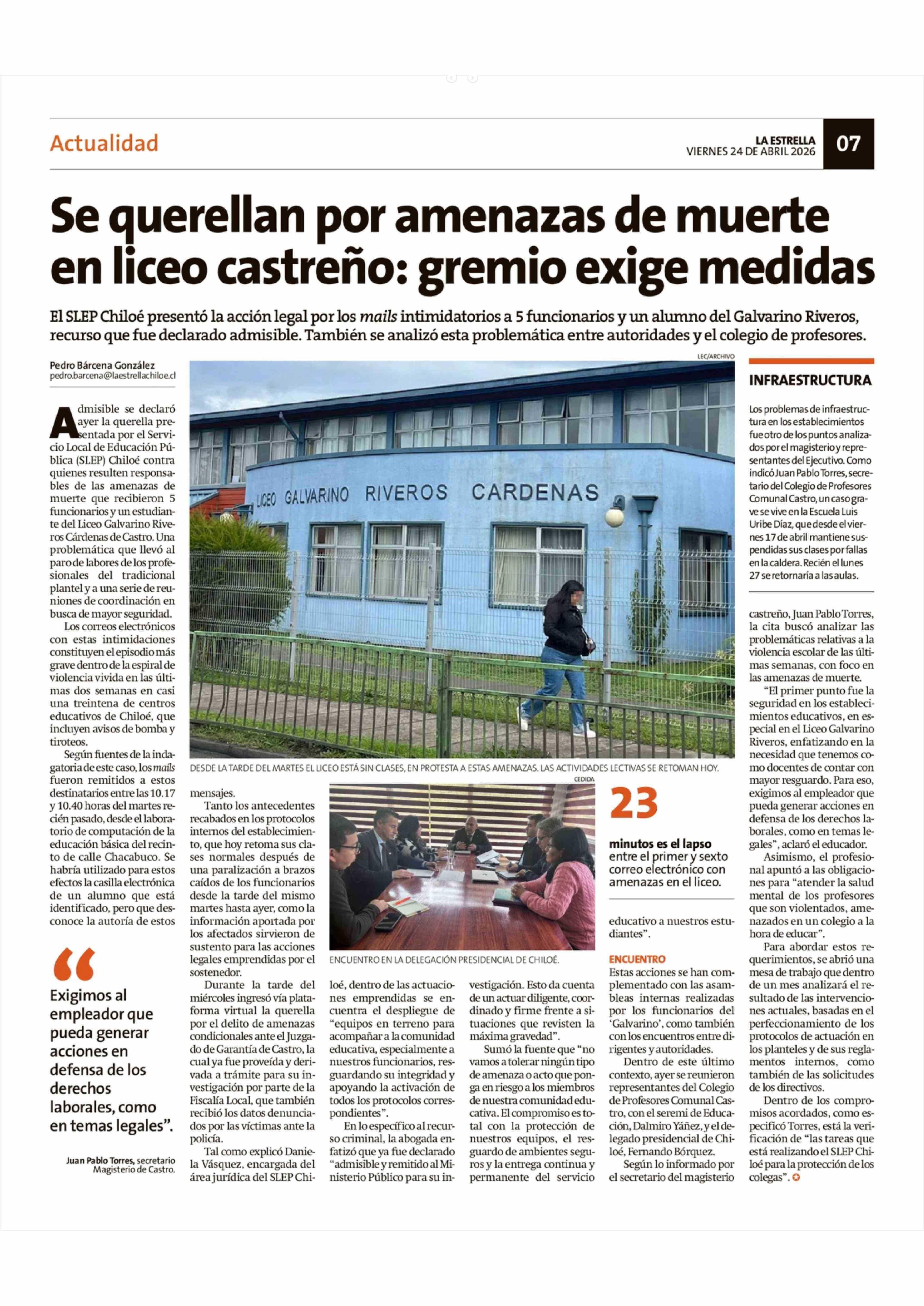 Se querellan por amenazas de muerte en liceo castreño: gremio exige medidas 24-04-2026 La Estrella de Chiloé |