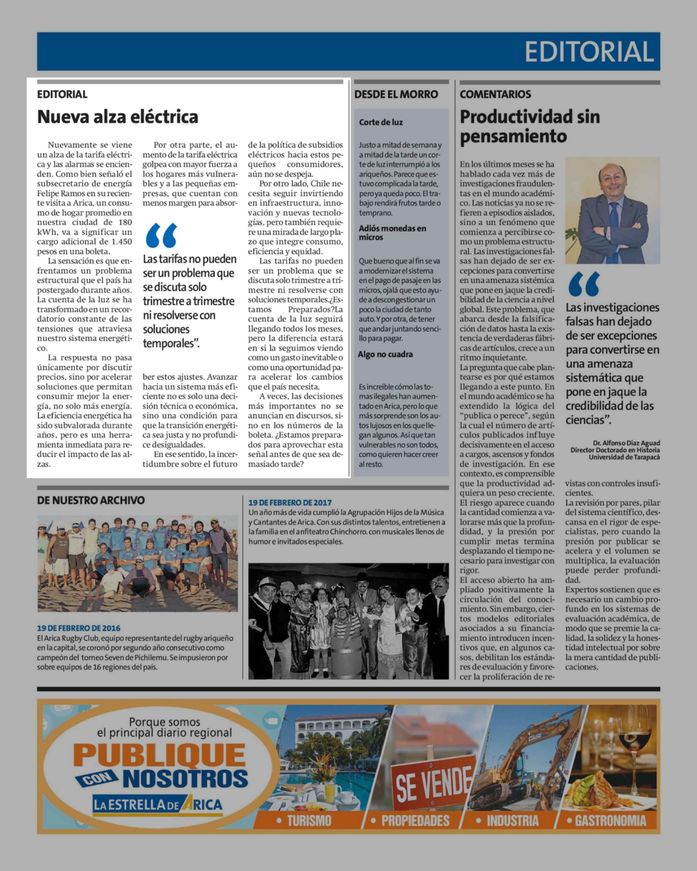 Editorial: Nueva alza eléctrica 19-02-2026 La Estrella de Arica |