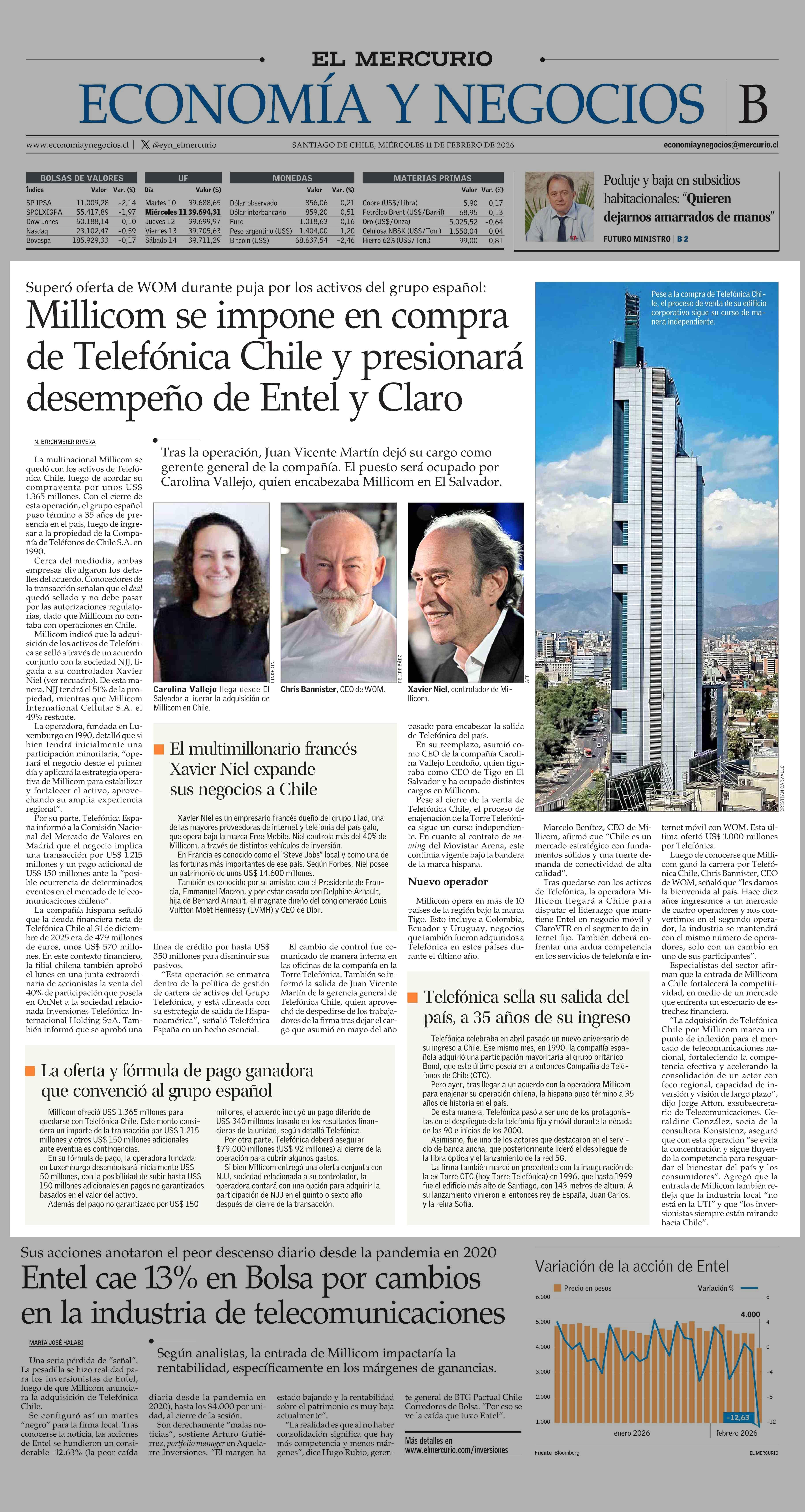 Millicom se impone en compra de Telefónica Chile y presionará desempeño de Entel y Claro 11-02-2026 El Mercurio |
