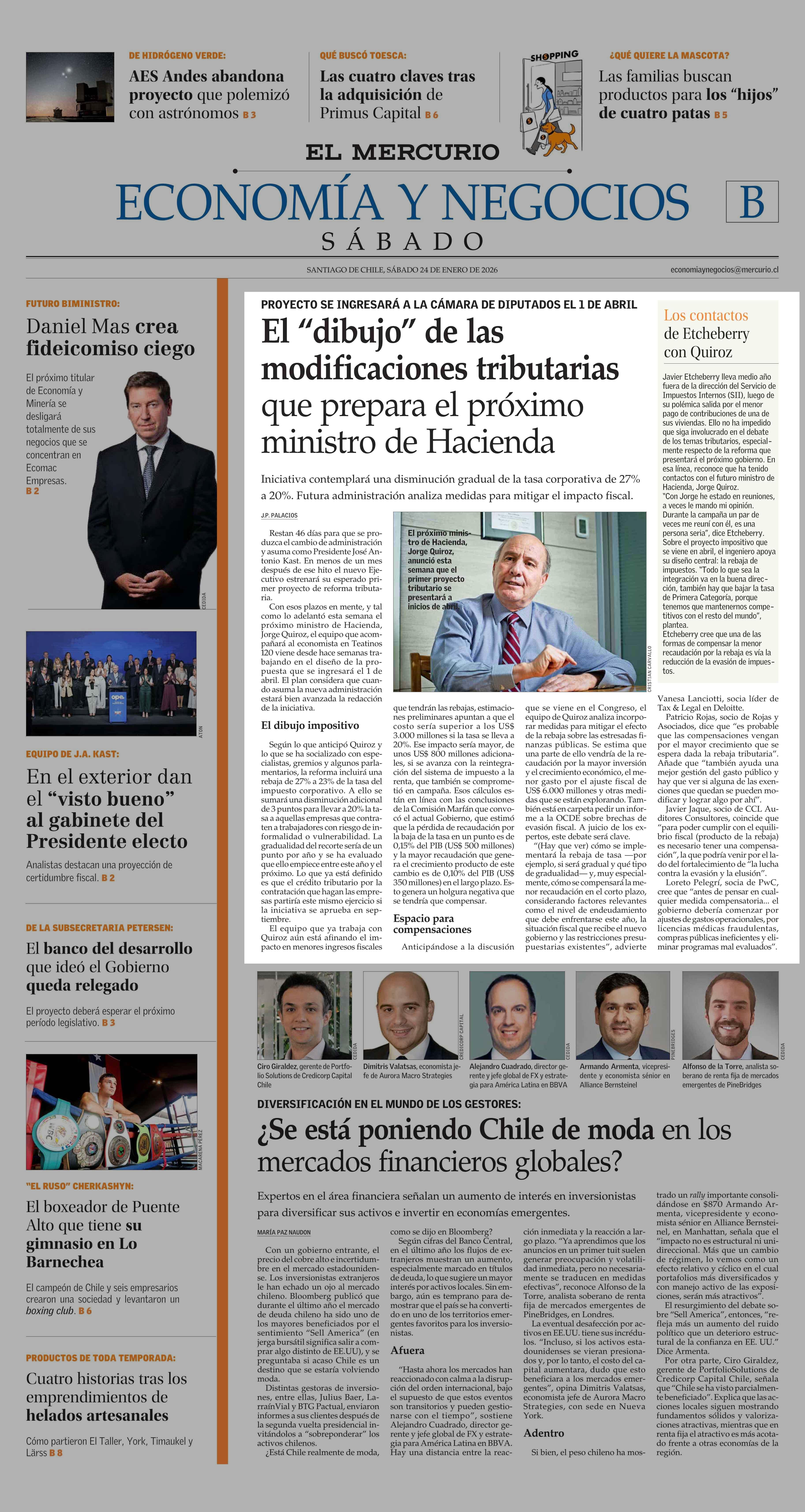El “dibujo” de las modificaciones tributarias que prepara el próximo ministro de Hacienda 24-01-2026 El Mercurio |