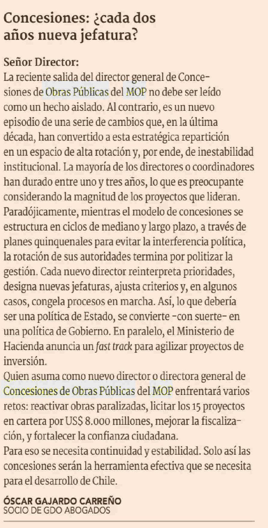 CARTAS: Concesiones: ¿cada dos años nueva jefatura? 29-05-2025 Diario Financiero |