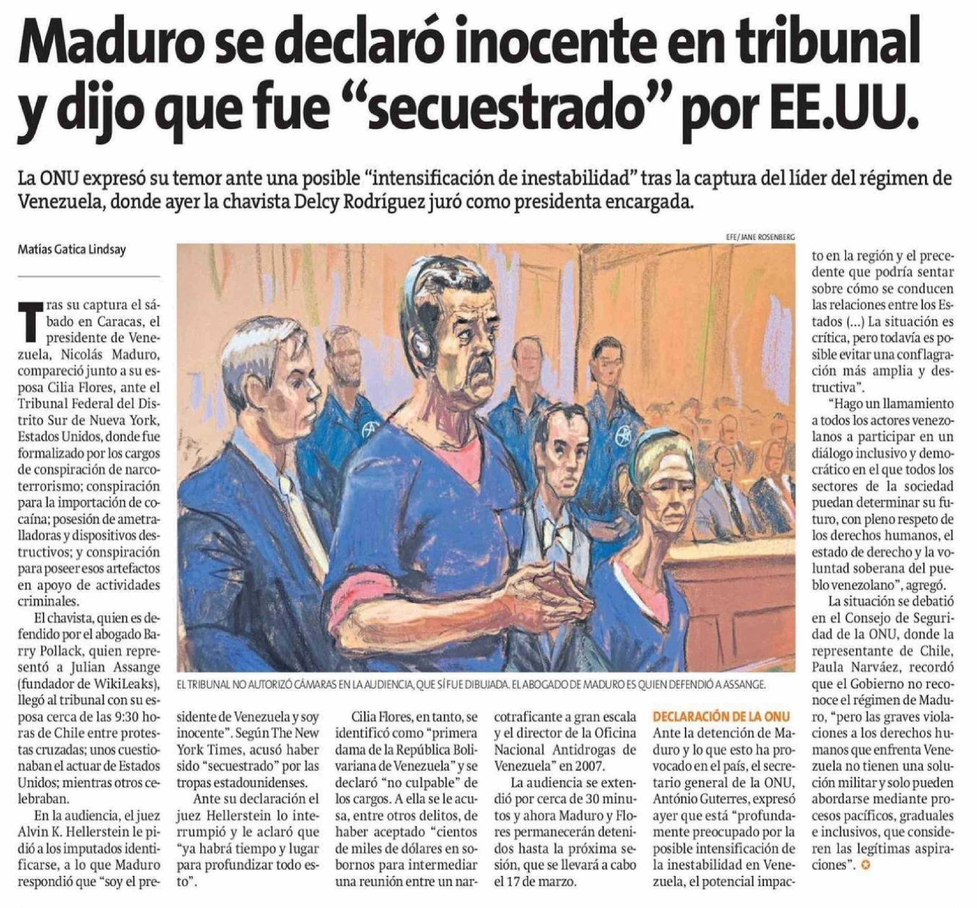 Maduro se declaró inocente en tribunal y dijo que fue "secuestrado" por EE.UU. 06-01-2026 La Estrella de Antofagasta |