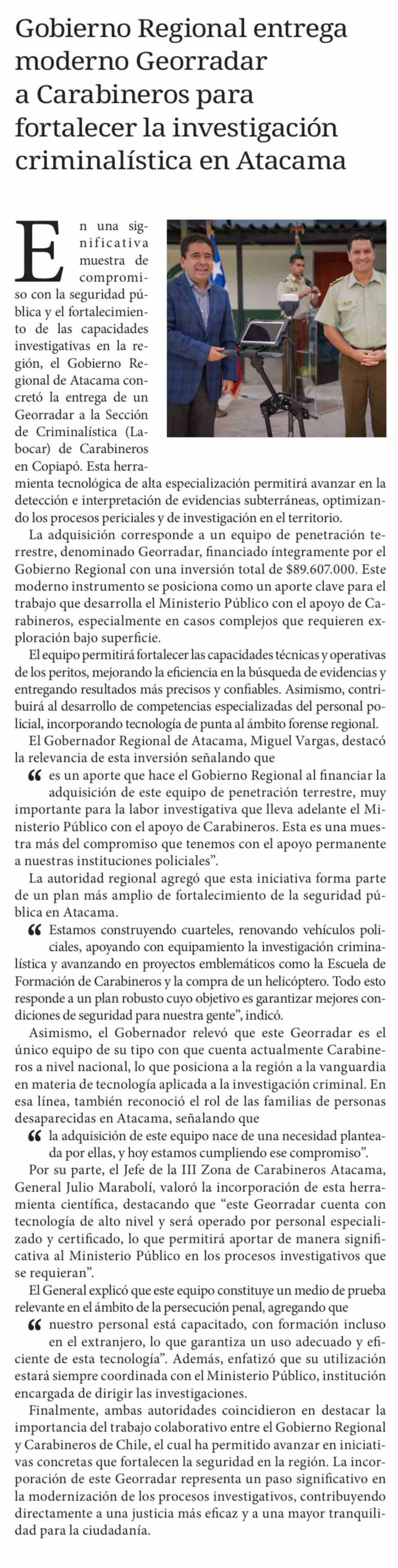 Título: Gobierno Regional entrega moderno Georradar a Carabineros para fortalecer la investigación criminalística en Atacama