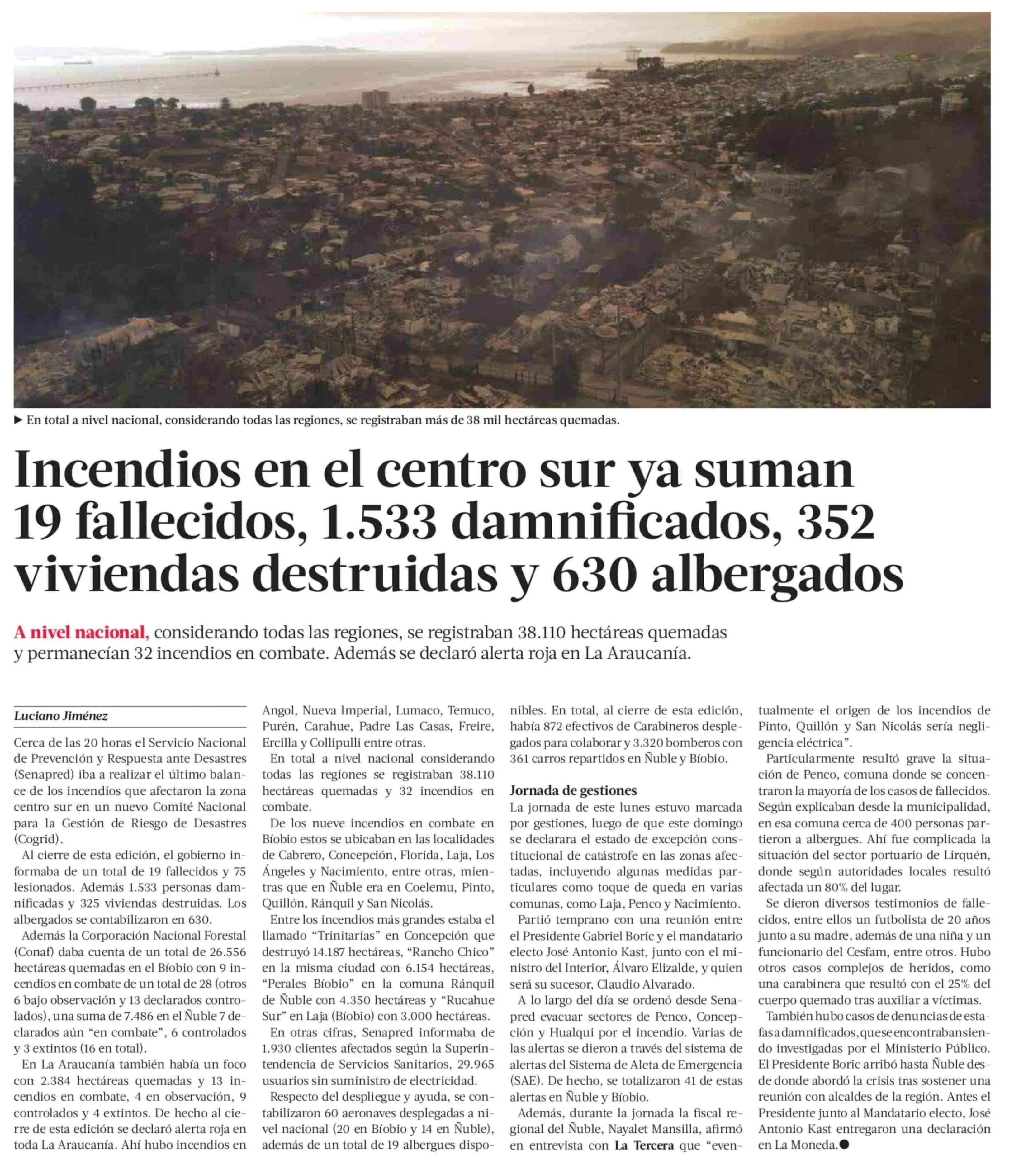Título: Incendios en el centro sur ya suman 19 fallecidos, 1.533 damnificados, 352 viviendas destruidas y 630 albergados