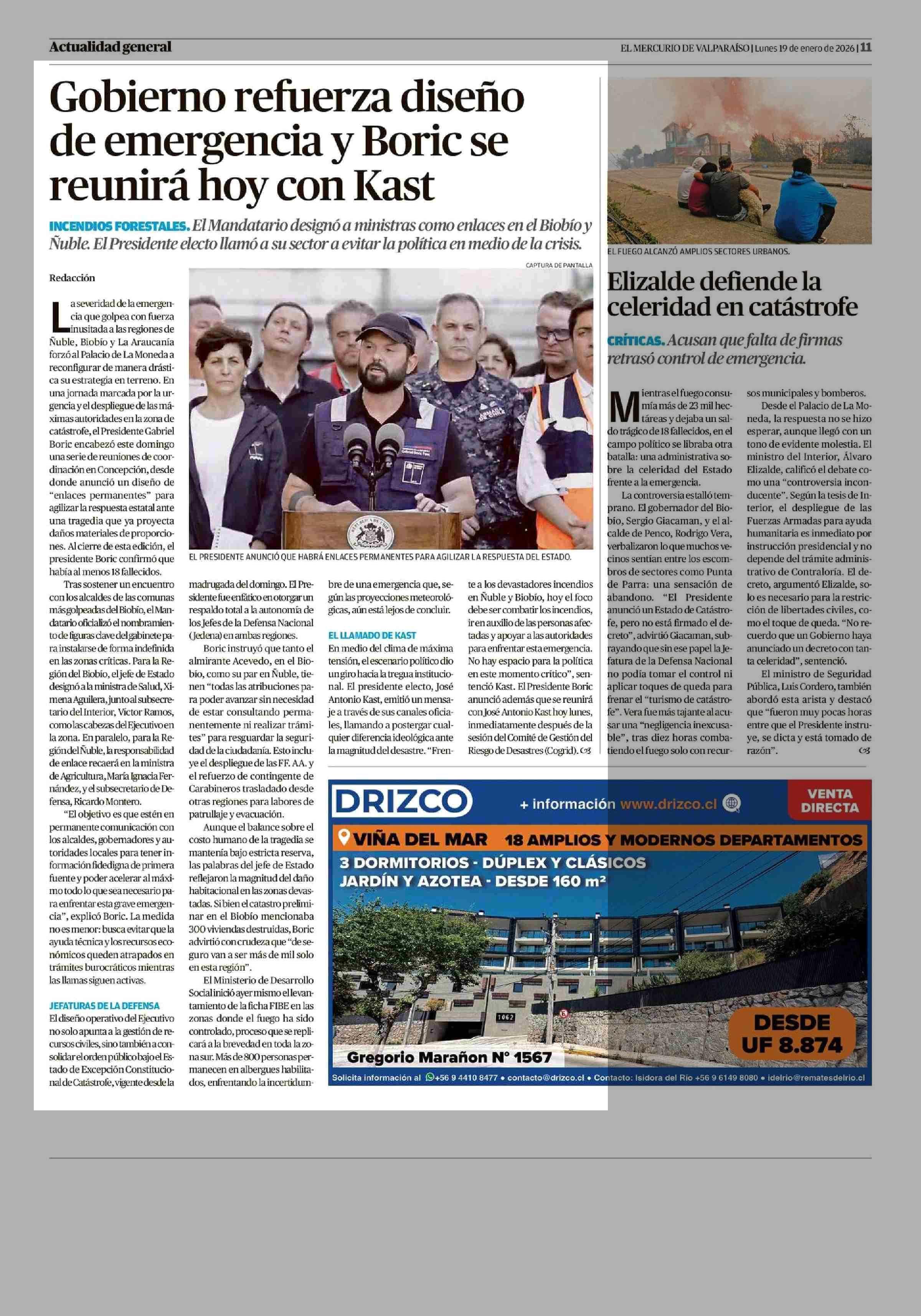 Título: Gobierno refuerza diseño de emergencia y Boric se reunirá hoy con Kast