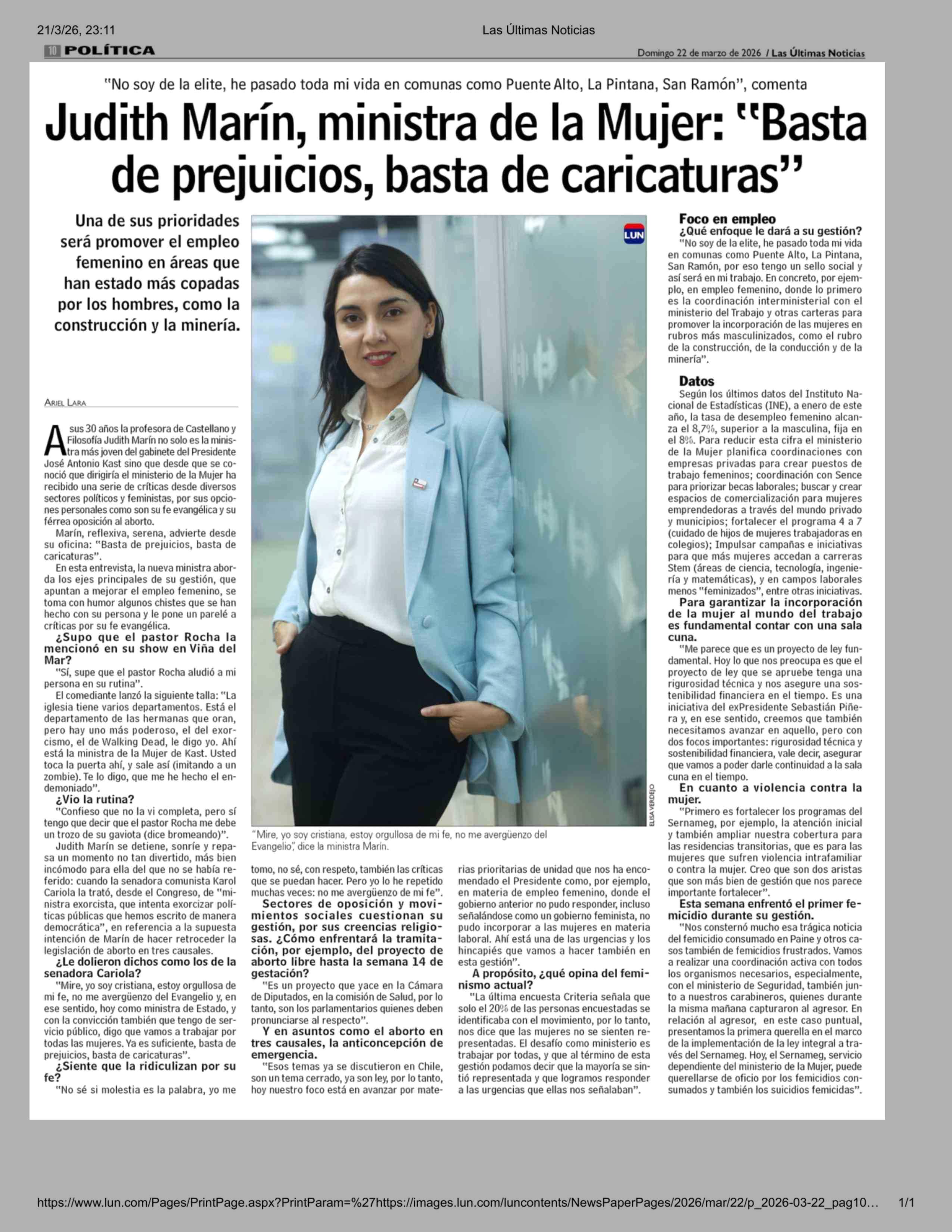 Judith Marín, ministra de la Mujer: "Basta de prejuicios, basta de caricaturas" 22-03-2026 Las Últimas Noticias |