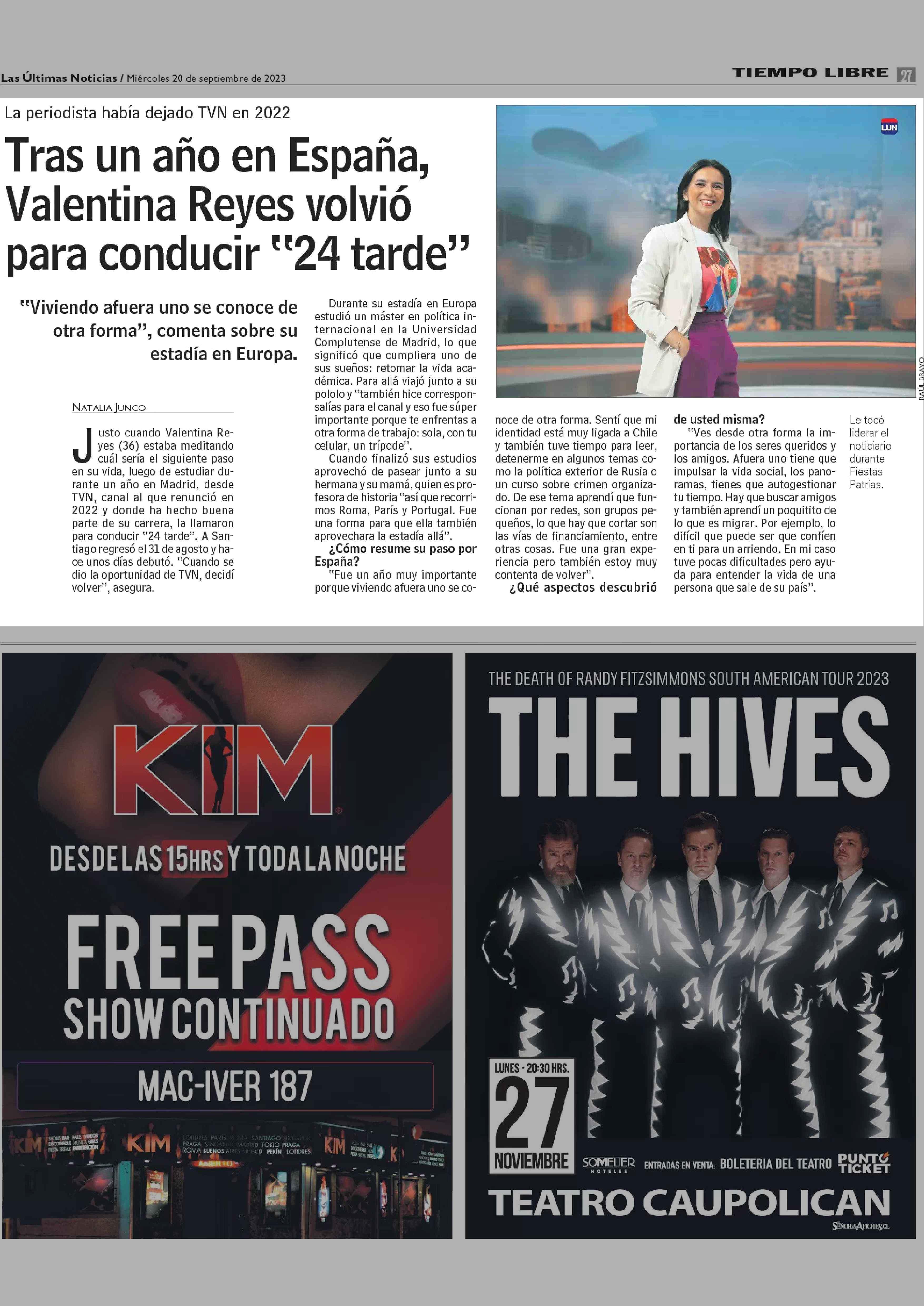 Tras un año en España, Valentina Reyes volvió para conducir "24 tarde” 20-09-2023 Las Últimas Noticias |