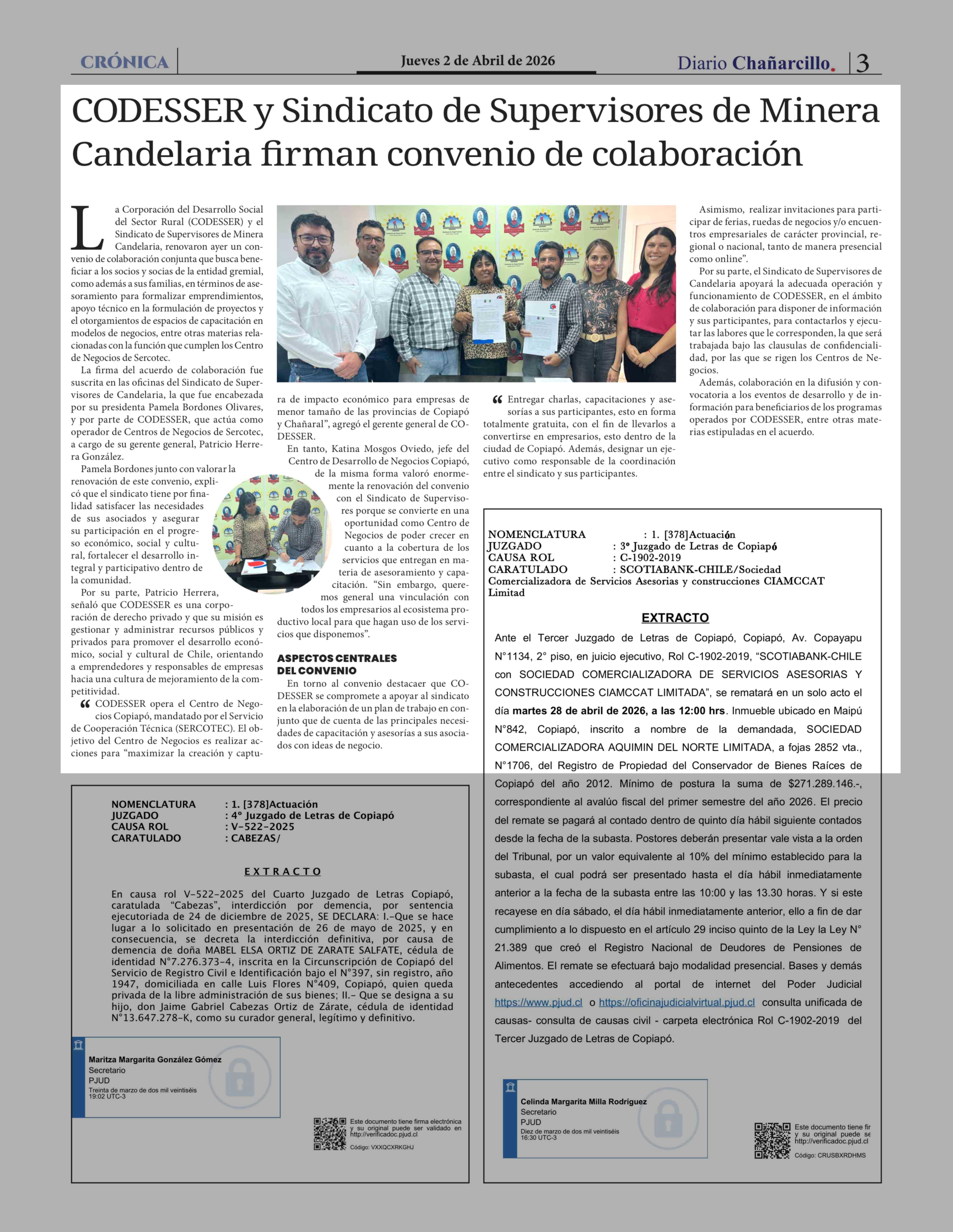 CODESSER y Sindicato de Supervisores de Minera Candelaria firman convenio de colaboración 02-04-2026 Diario Chañarcillo |