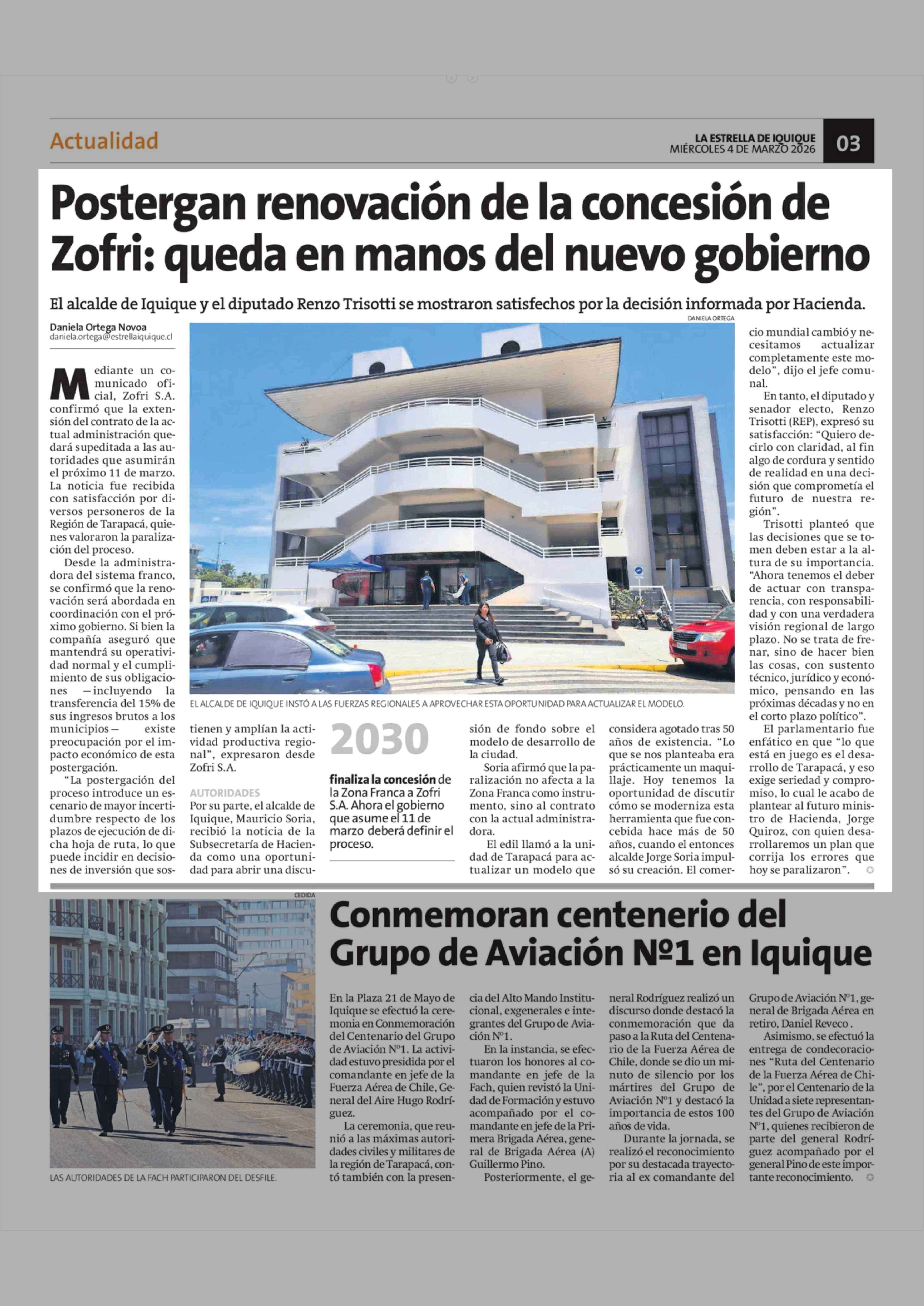 Postergan renovación de la concesión de Zofri: queda en manos del nuevo gobierno 04-03-2026 La Estrella de Iquique |