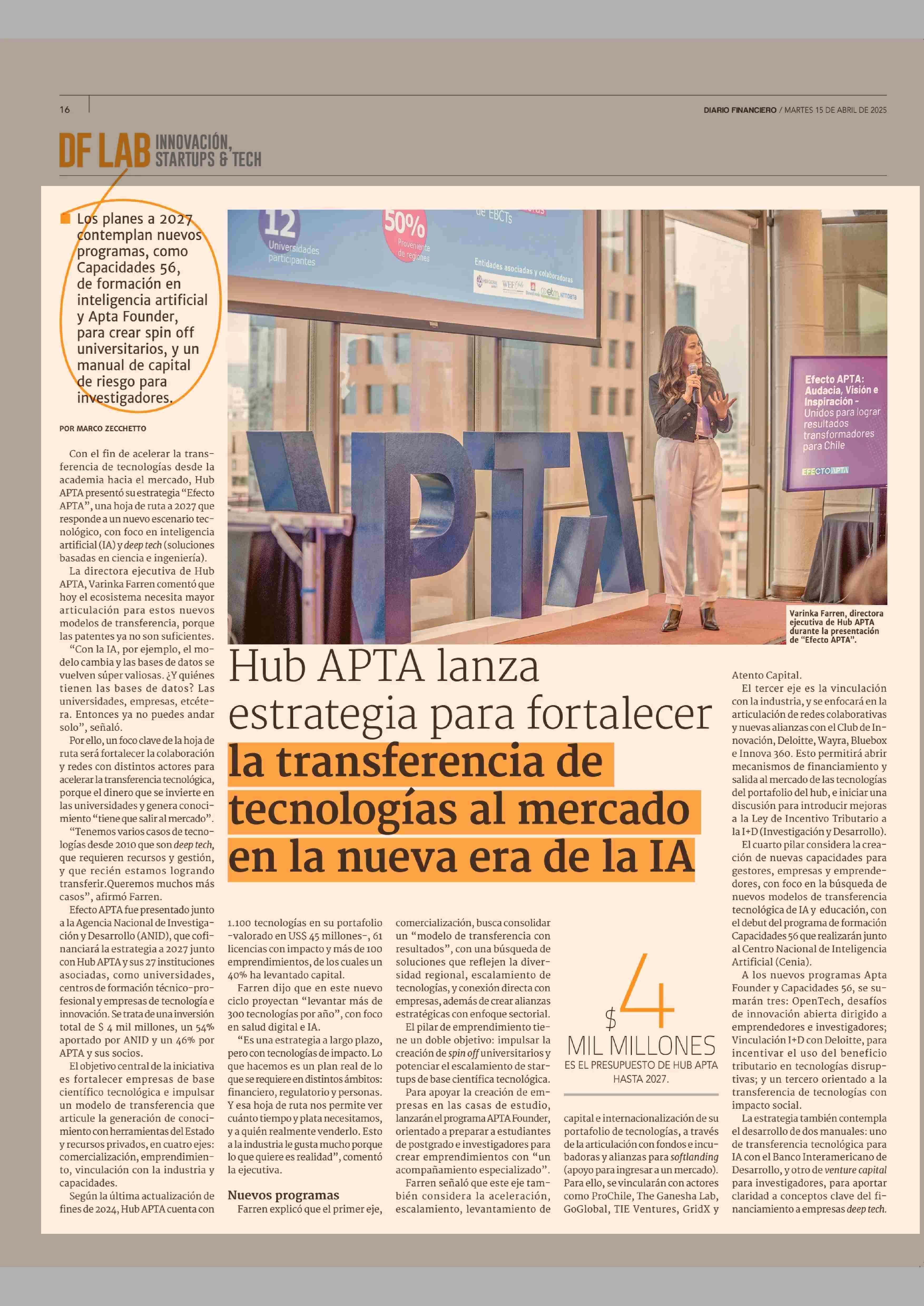 Hub APTA lanza estrategia para fortalecer la transferencia de tecnologías al mercado en la nueva era de la IA 15-04-2025 Diario Financiero |