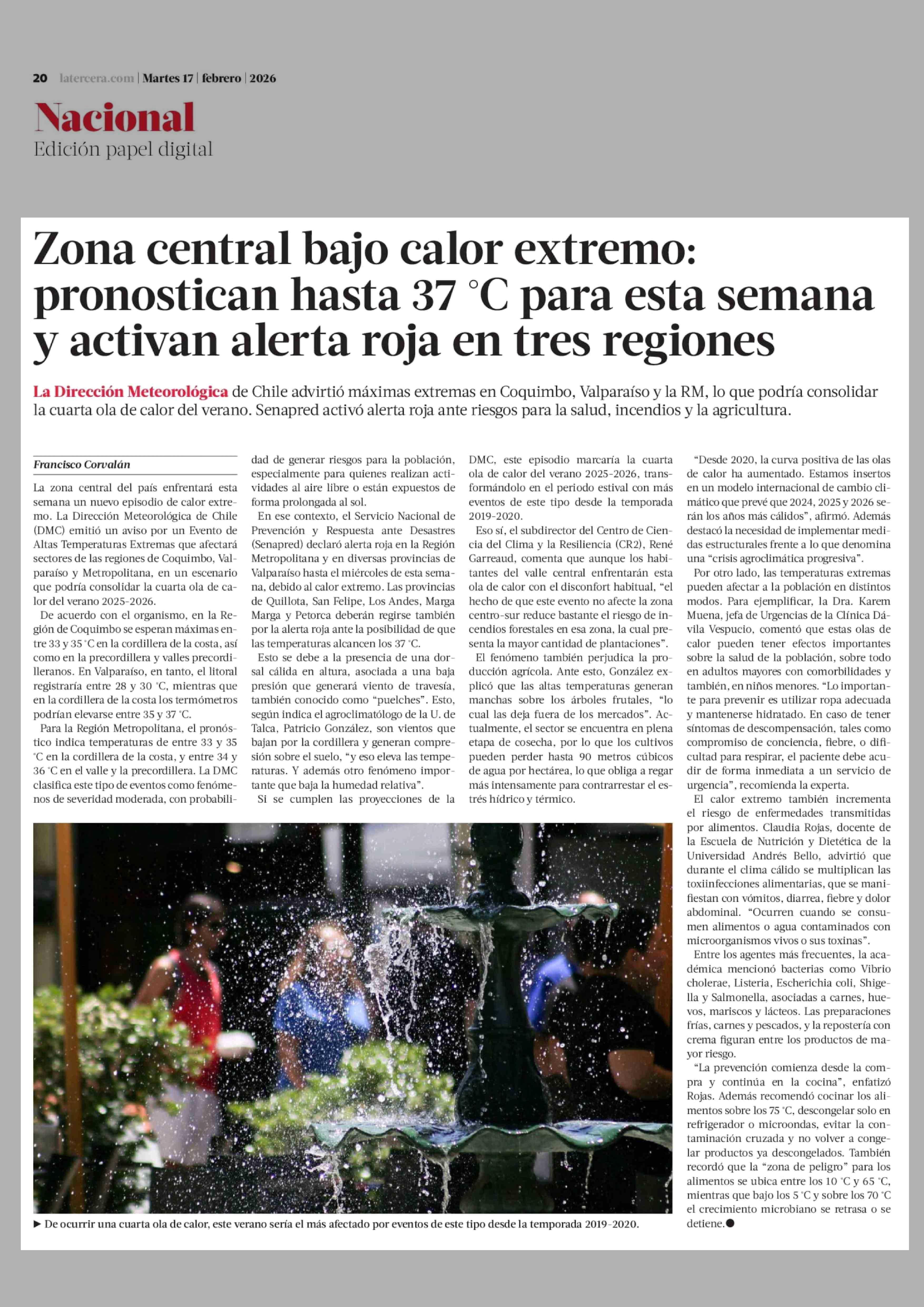 Zona central bajo calor extremo: pronostican hasta 37 ? para esta semana y activan alerta roja en tres regiones 17-02-2026 La Tercera |