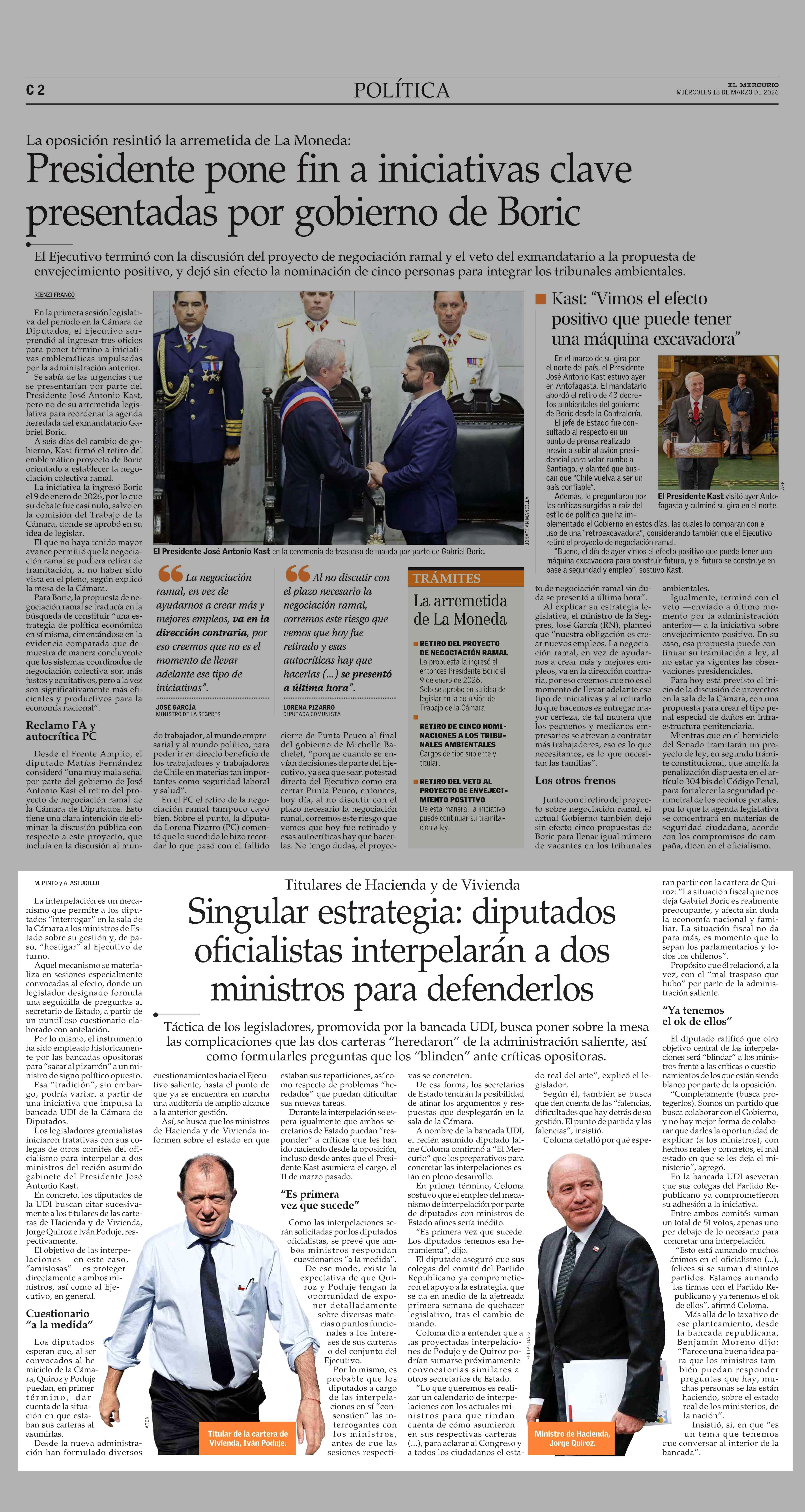 Singular estrategia: diputados oficialistas interpelarán a dos ministros para defenderlos 18-03-2026 El Mercurio |